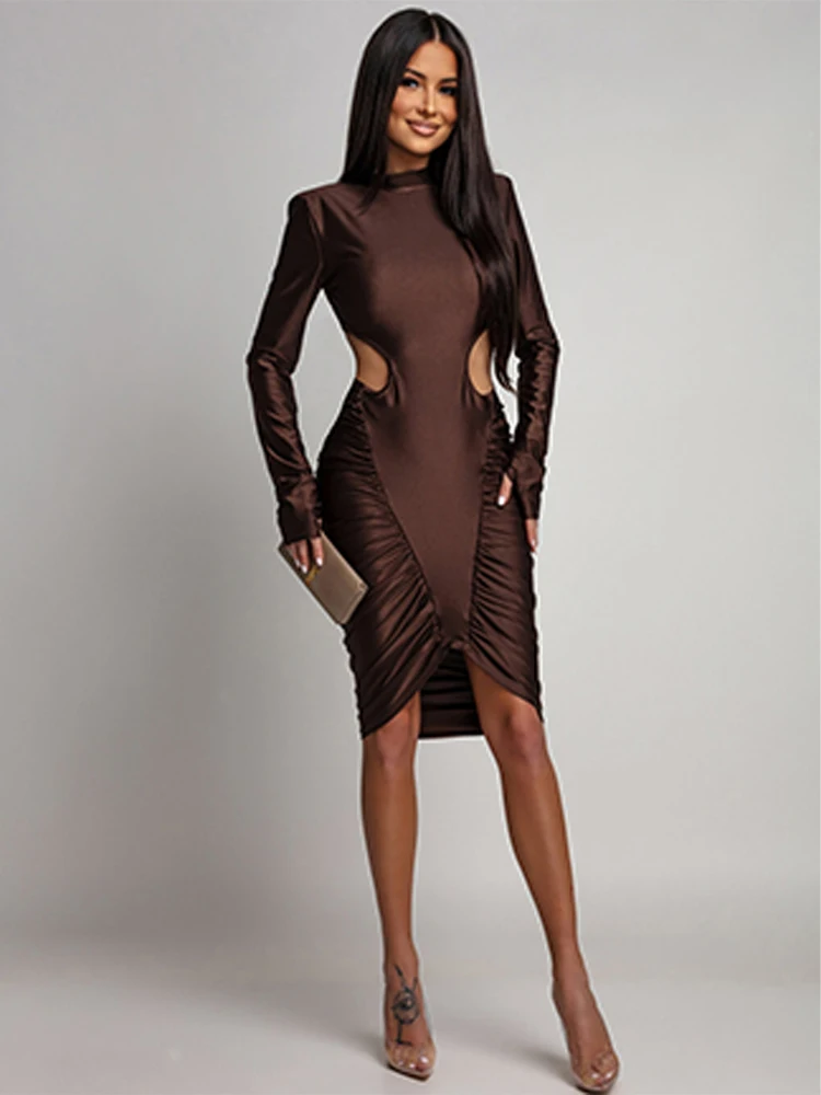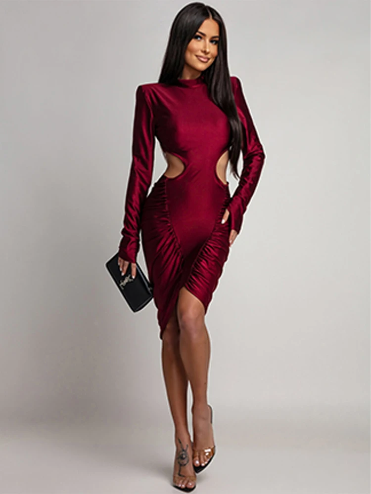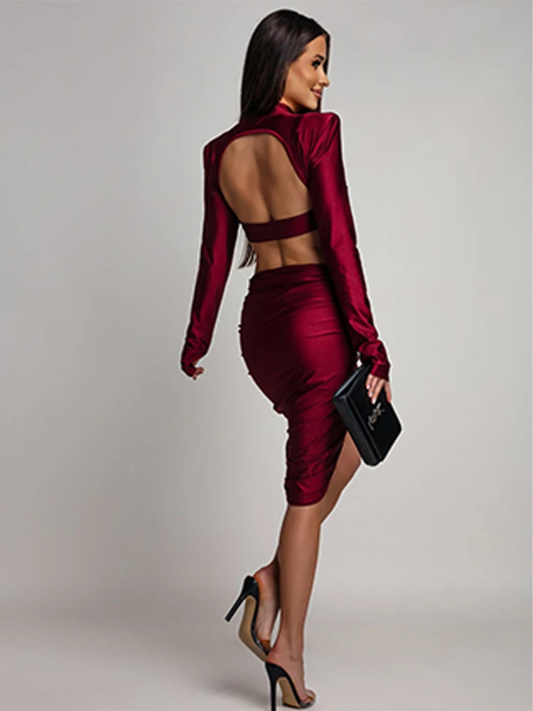 I dettagli cut-out strategici sui lati mettono in risalto la vita, conferendo un tocco di sensualità raffinata. Le maniche lunghe bilanciano la scollatura accollata e gli audaci spacchi laterali.