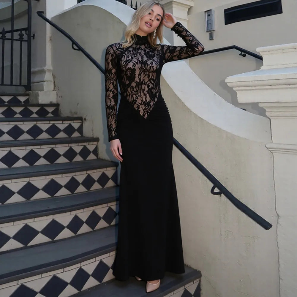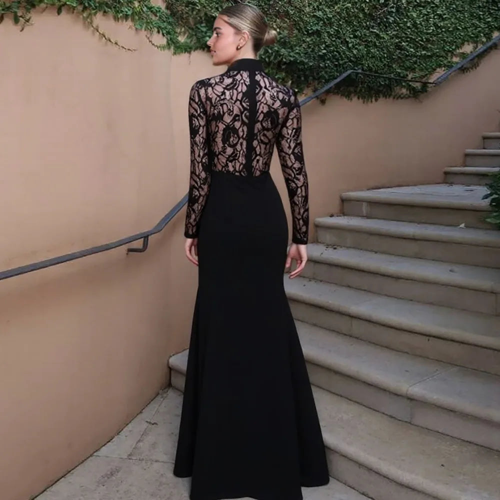 Vestito Lungo Nero con Pizzo - Eleganza Sensuale a Maniche Lunghe