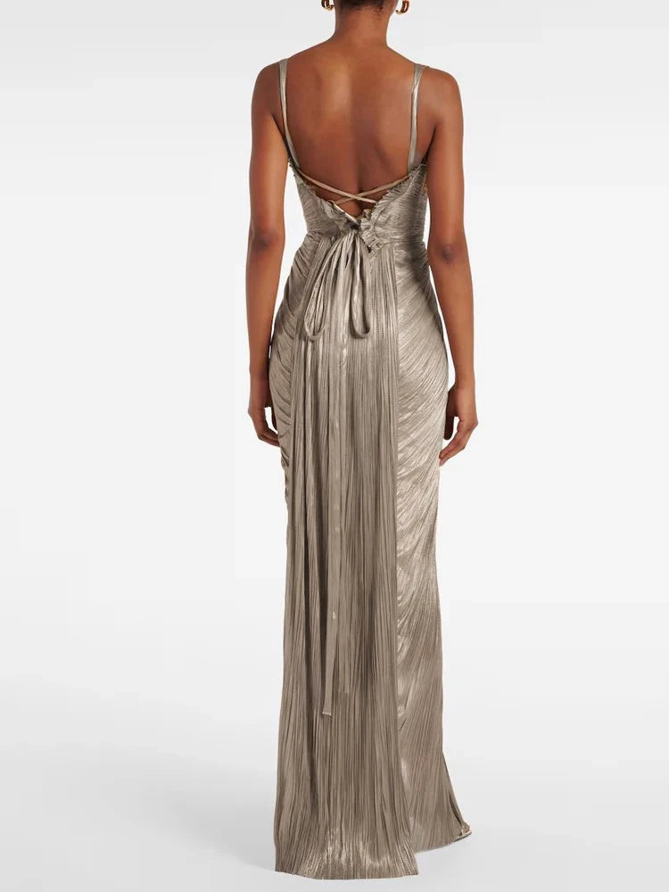 Un abito da sera che cattura l'attenzione con eleganza. La schiena scoperta e i dettagli con lacci creano un look audace ma raffinato, perfetto per chi ama distinguersi con classe.