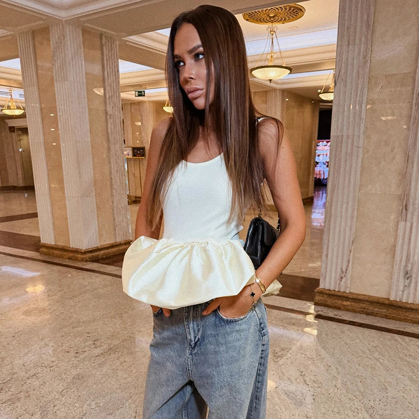 Scopri il top elegante raso bianco con romantici volant, perfetto per l'estate e le occasioni speciali. Questa canotta donna senza maniche combina tessuto satinato luxury con dettagli femminili per un look sofisticato e fresco.