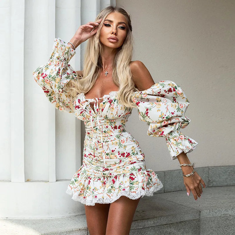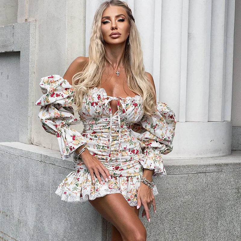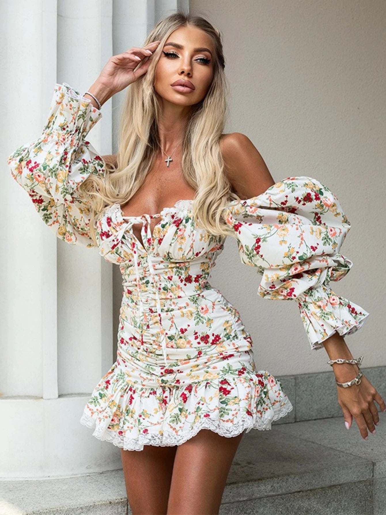 Un mini abito dal carattere dolce e contemporaneo: scollo monospalla asimmetrico, maniche lunghe a palloncino e silhouette A-line con vita alta empire che valorizza la figura in modo naturale. La stampa mista lo rende unico e versatile, perfetto per la mezza stagione.