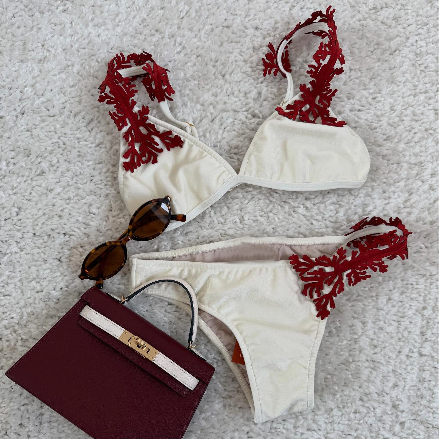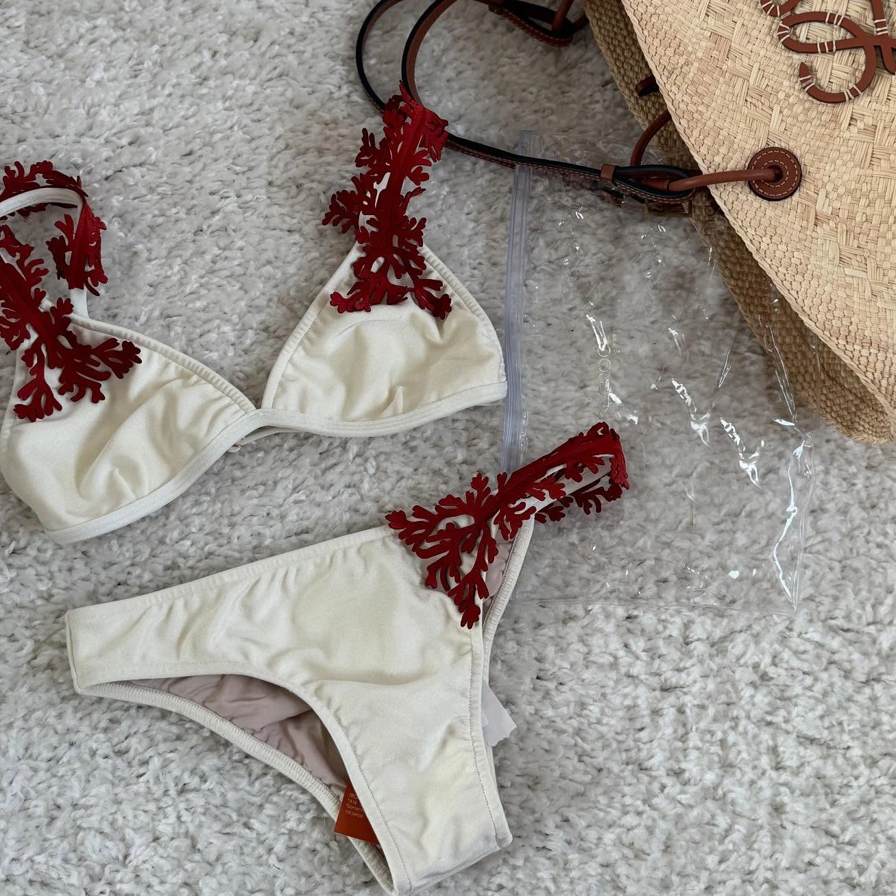 Il top a trangolo,in un candido bianco, offre un sostegno naturale e una silhouette femminile.Le spalline sottili, arricchite da un vivace motivo floreale corallo e un delicato volant, aggiungono un tocco di colore e un'allure romantica.