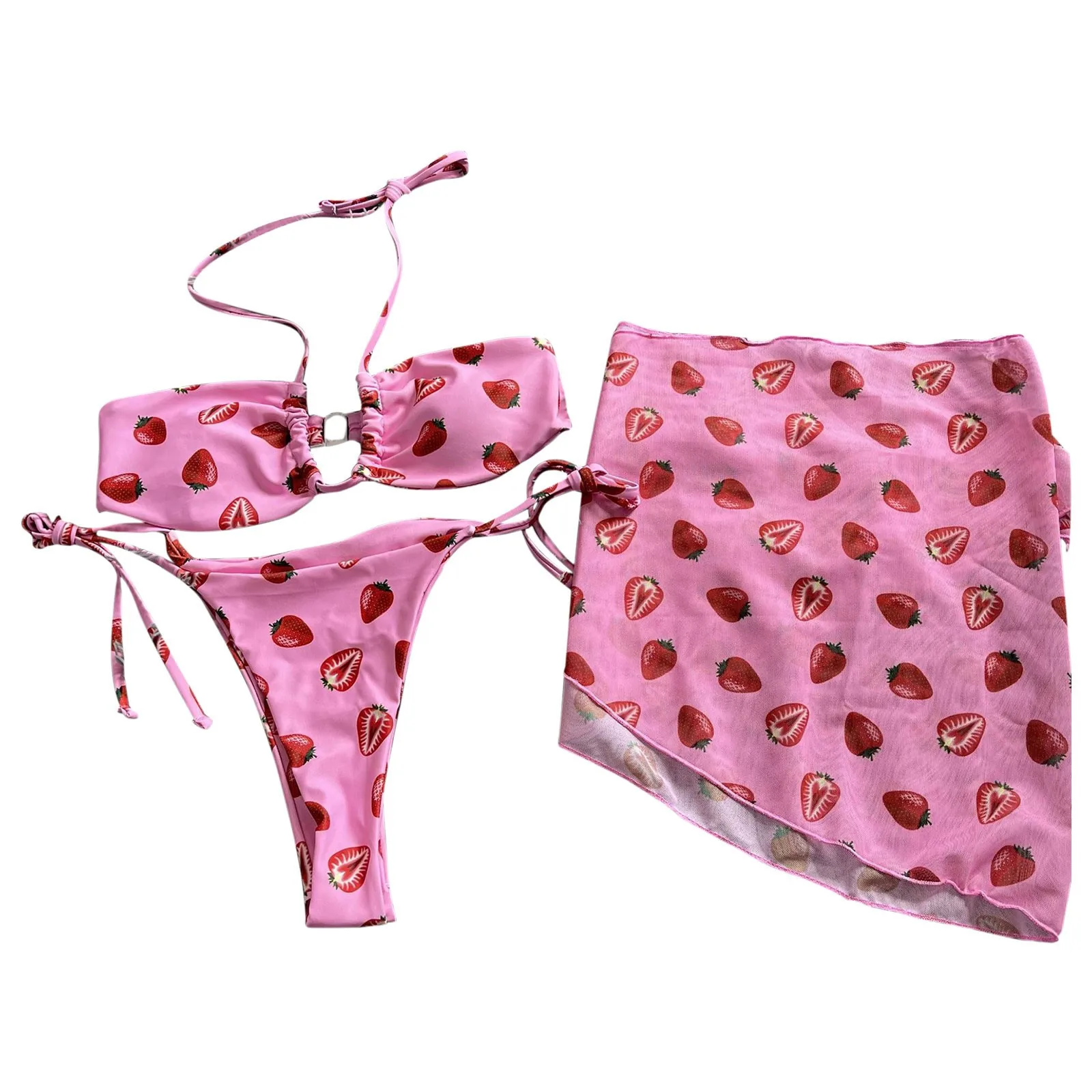 Costume da bagno a tre pezzi in rete con fragole carine, con lacci e coulisse