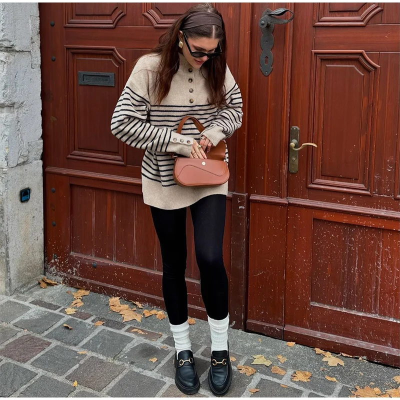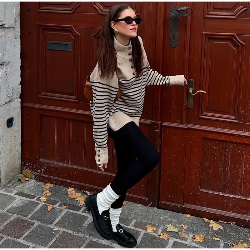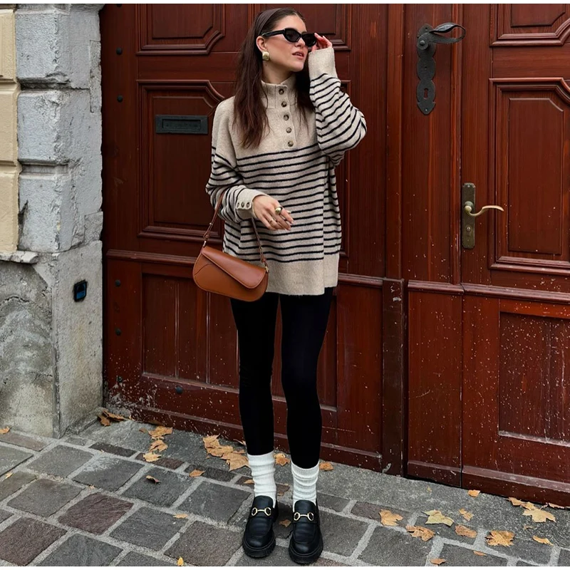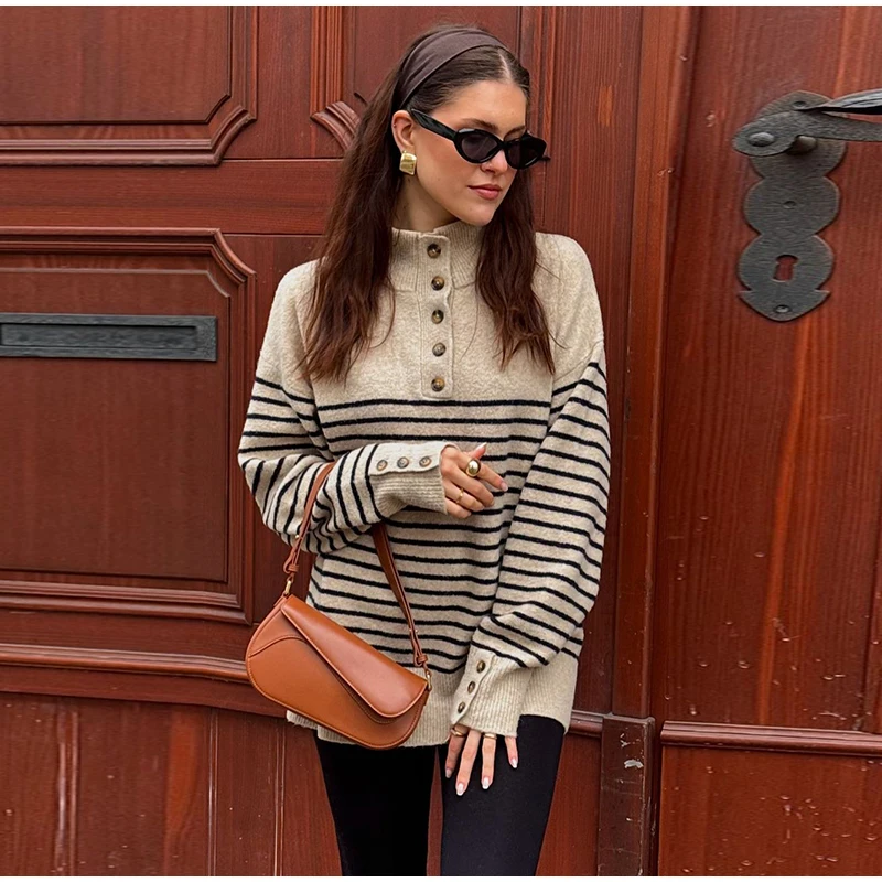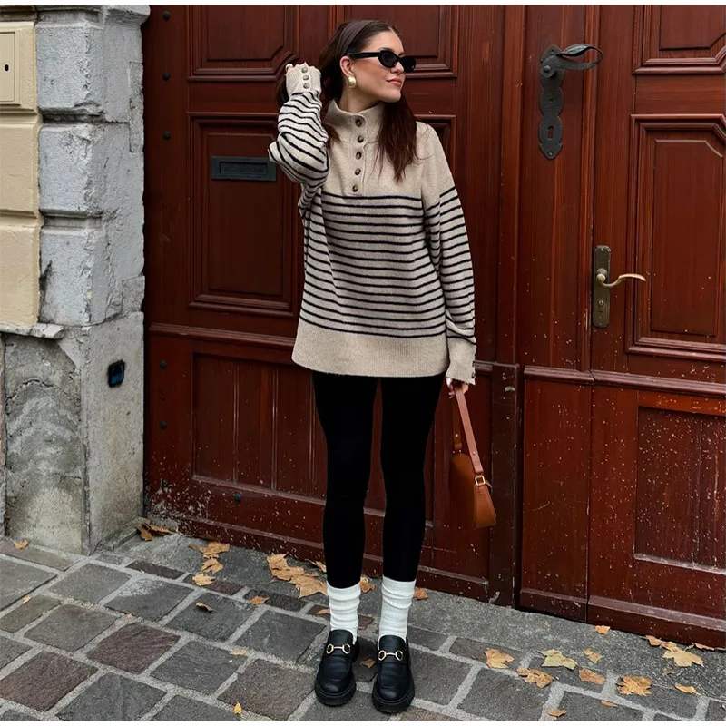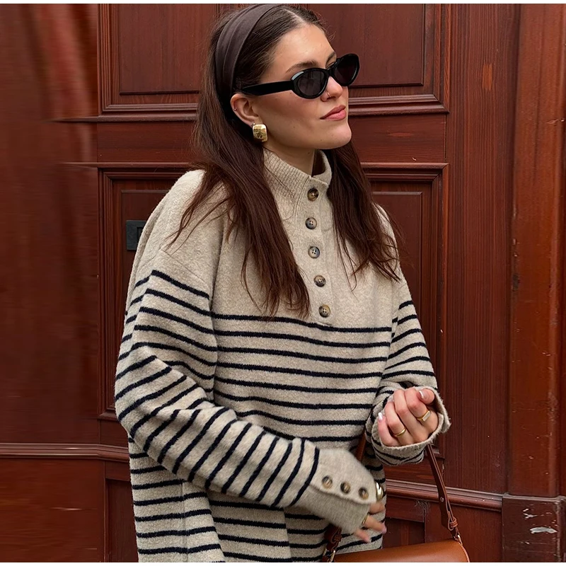 Questo pullover unisce il comfort di un taglio morbido e abbondante con l'eleganza senza tempo del motivo a righe. Il collo alto con mezza abbottonatura aggiunge un tocco sofisticato, permettendoti di regolare lo scollo. Ideale da abbinare a leggings o jeans skinny per un look casual-chic impeccabile, proprio come l'outfit in foto.