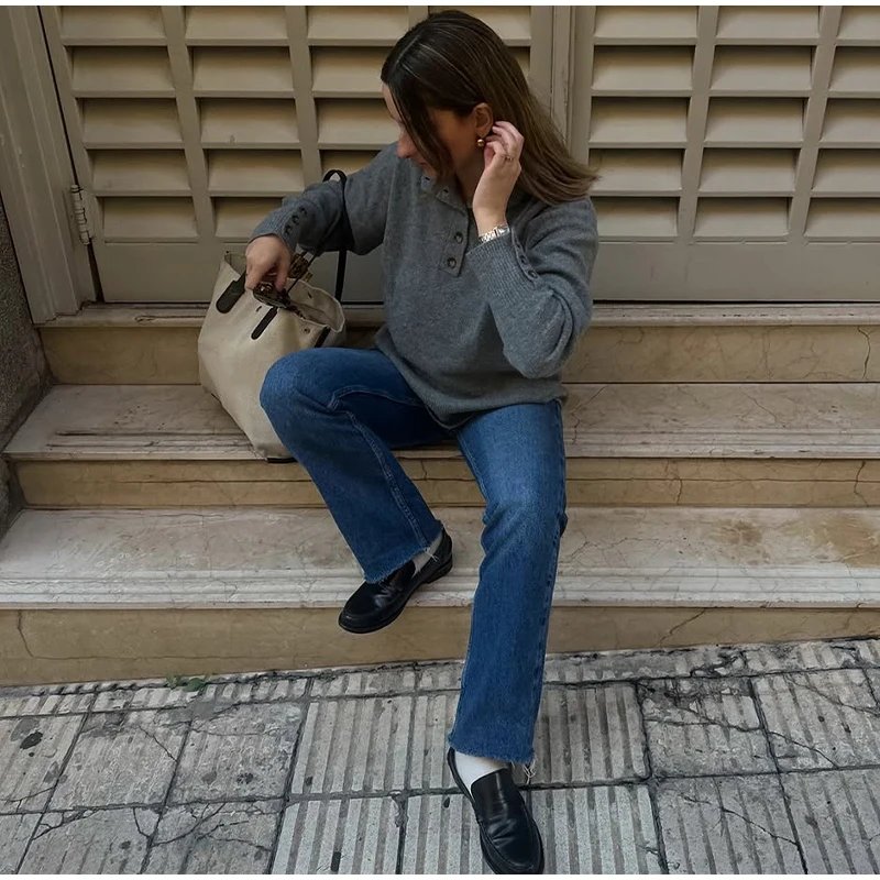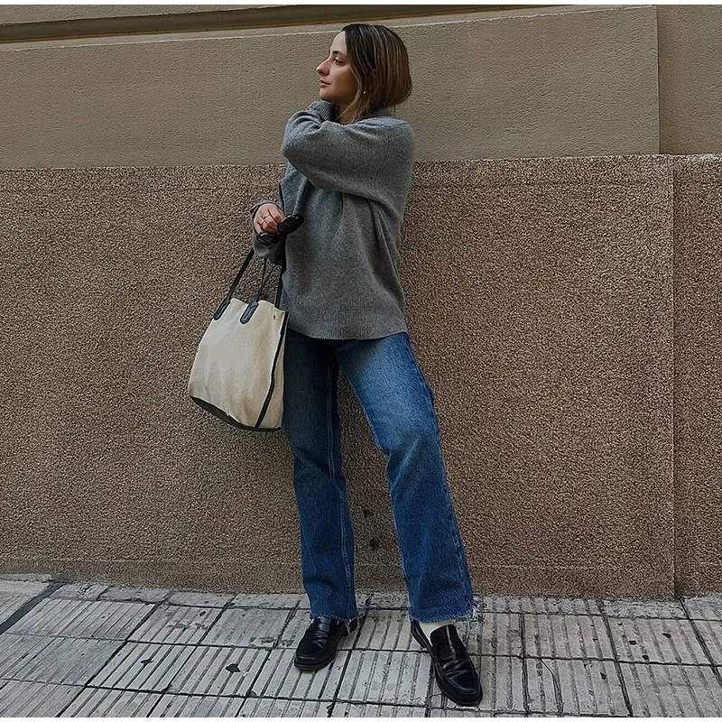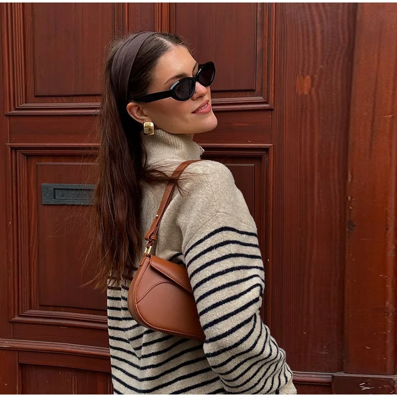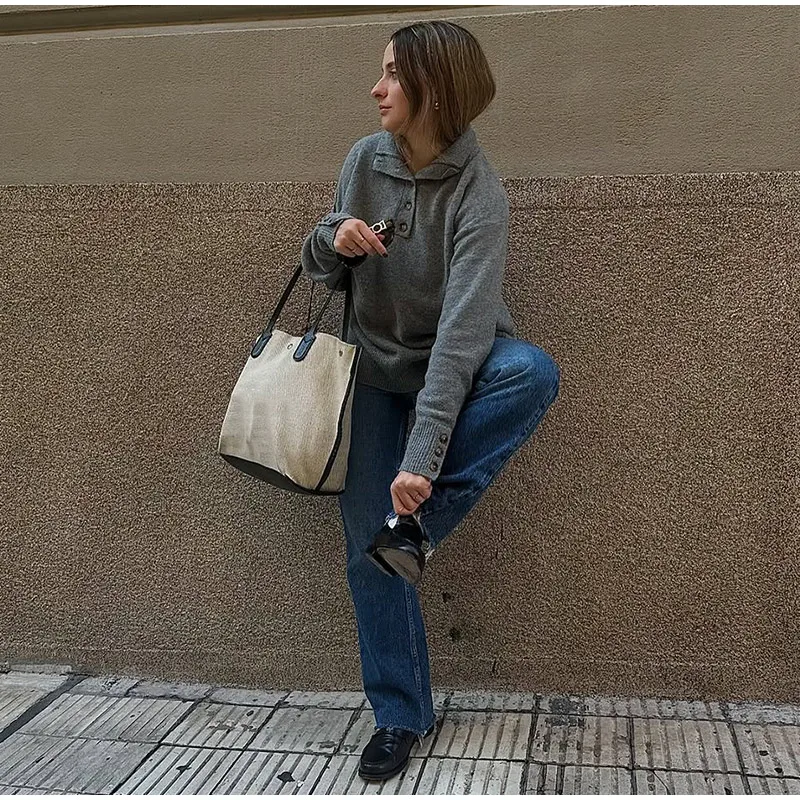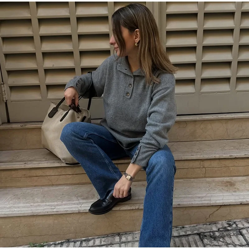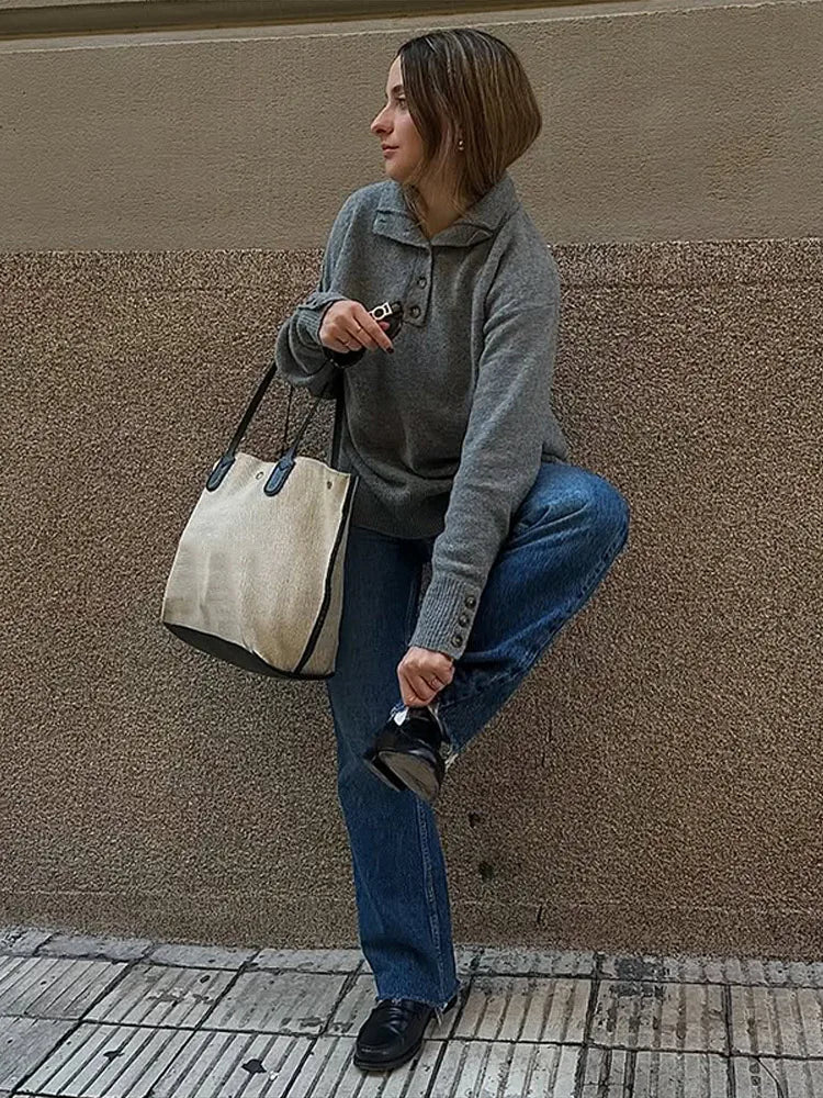 Questo pullover unisce il comfort di un taglio morbido e abbondante con l'eleganza senza tempo del motivo a righe. Il collo alto con mezza abbottonatura aggiunge un tocco sofisticato, permettendoti di regolare lo scollo. Ideale da abbinare a leggings o jeans skinny per un look casual-chic impeccabile, proprio come l'outfit in foto.