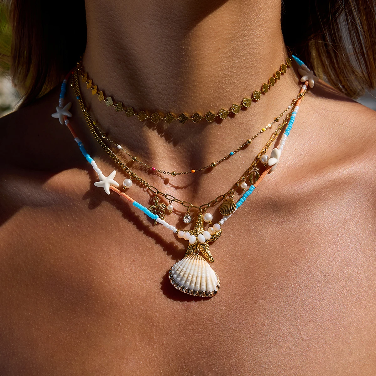 Preparati a sfoggiare un look da vera Dea con il nostro incantevole set di collane Thalassa's, l accessorio indispensabile per l'esatte 2025. Questo set sapientemente stratificato cattura l'essenza delle giornate baciate dal sole e dalle notti stellate in riva al mare. Il design presenta una fusione armoniosa di elementi marini e dettagli scintillanti: