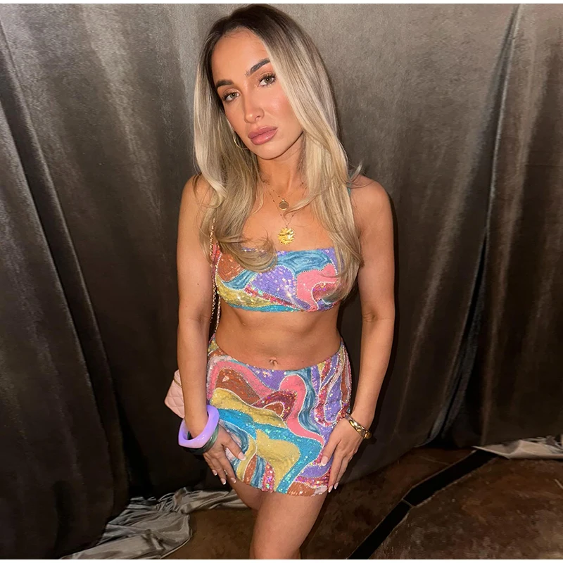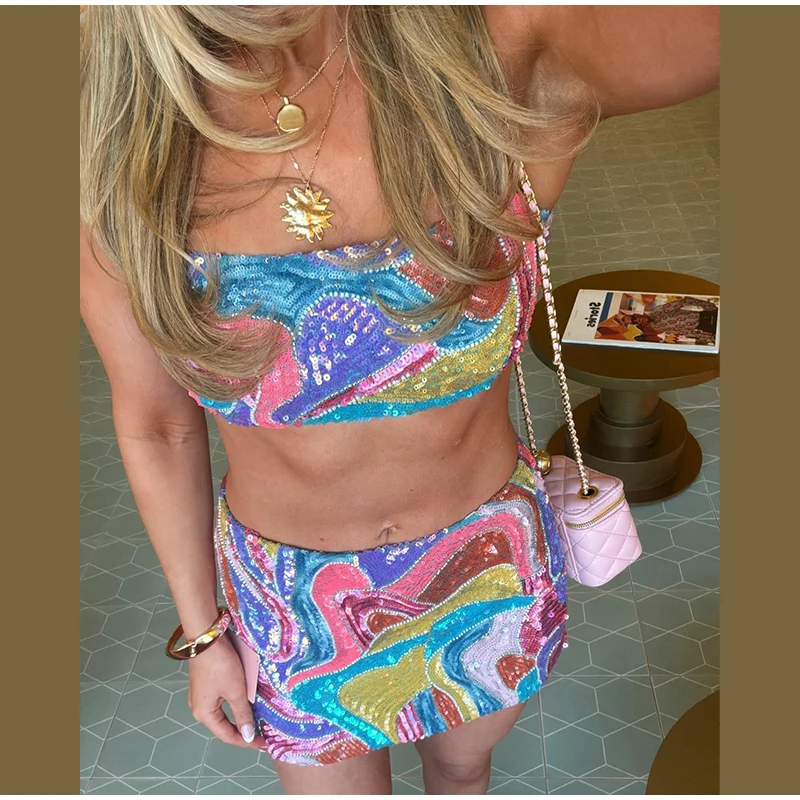 Questo splendido set due pezzi, composto da un top a fascia con spalline sottili e un pareo abbinato, è caratterizzato da una vivace fantasia con sfumature di azzurro, rosa, giallo e viola-