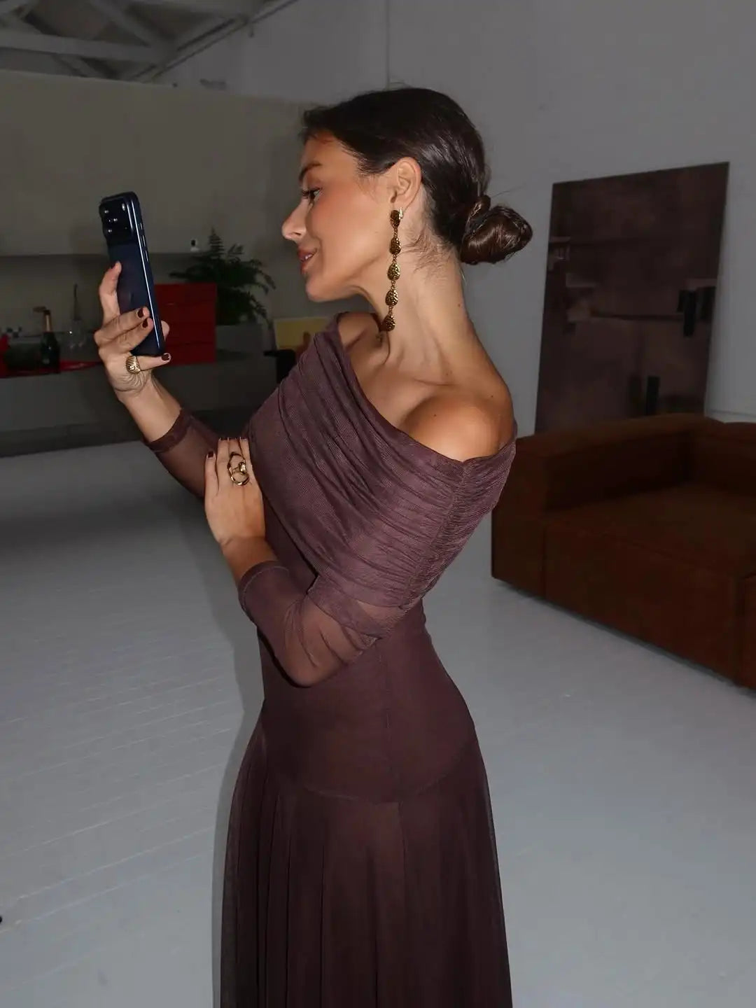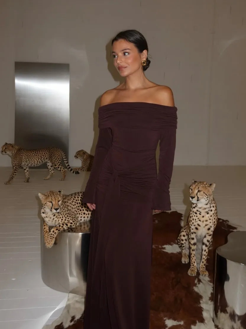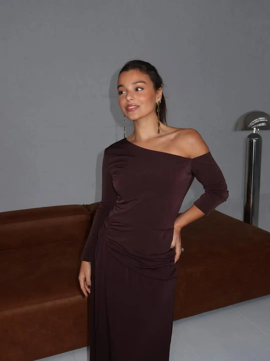 - Manica lunga asimmetrica - Dettaglio unico che bilancia il décolleté scoperto