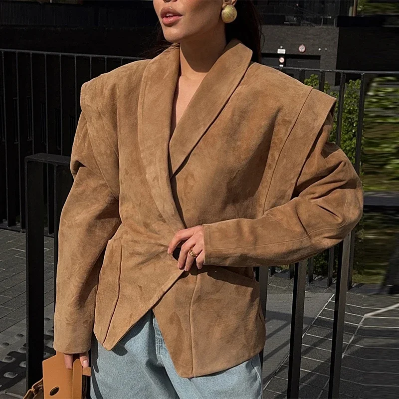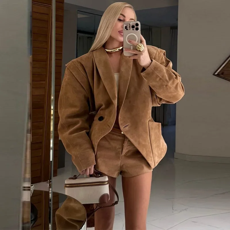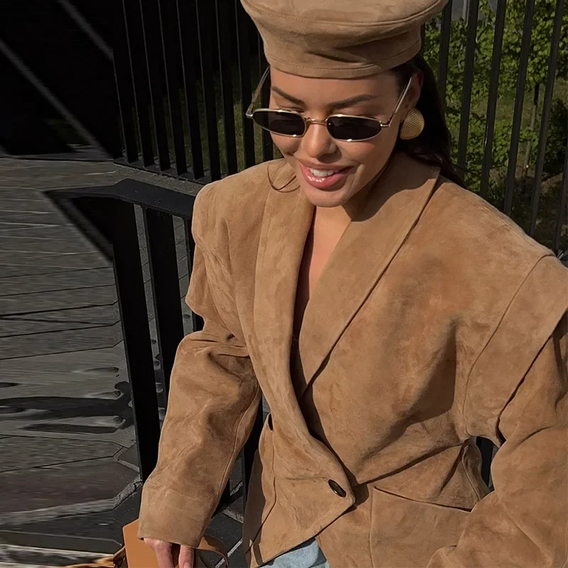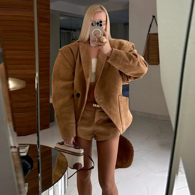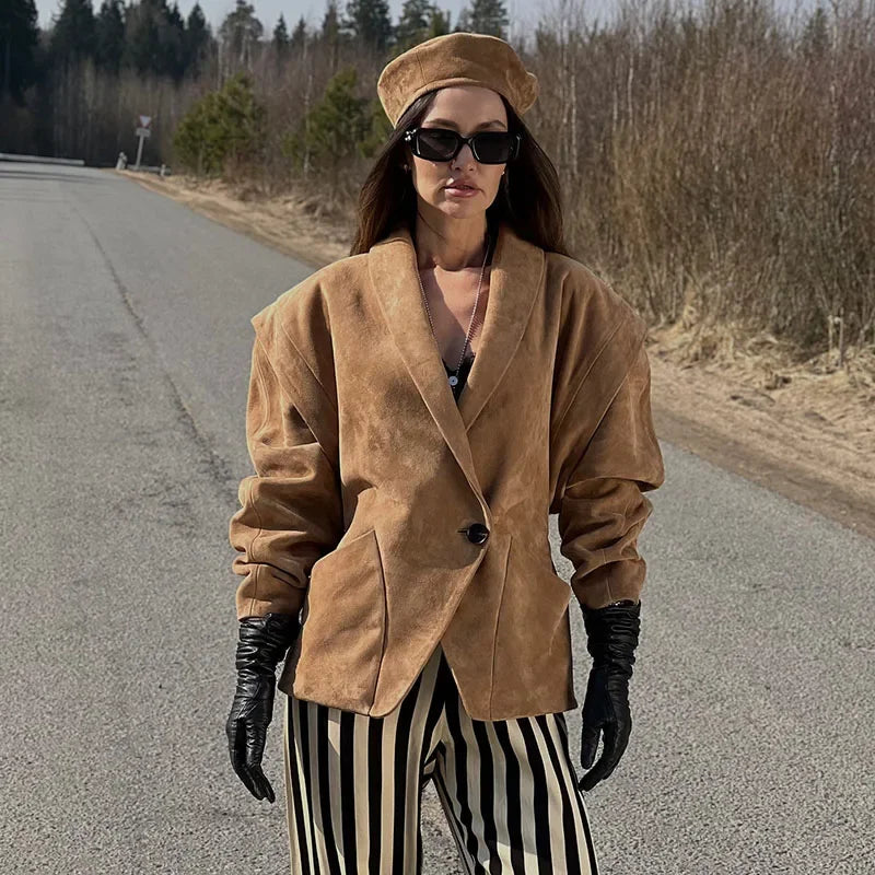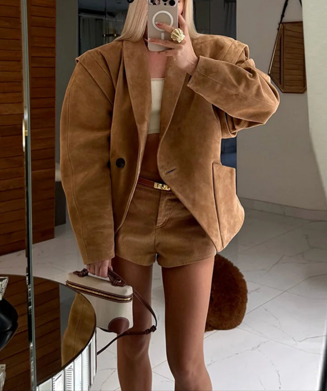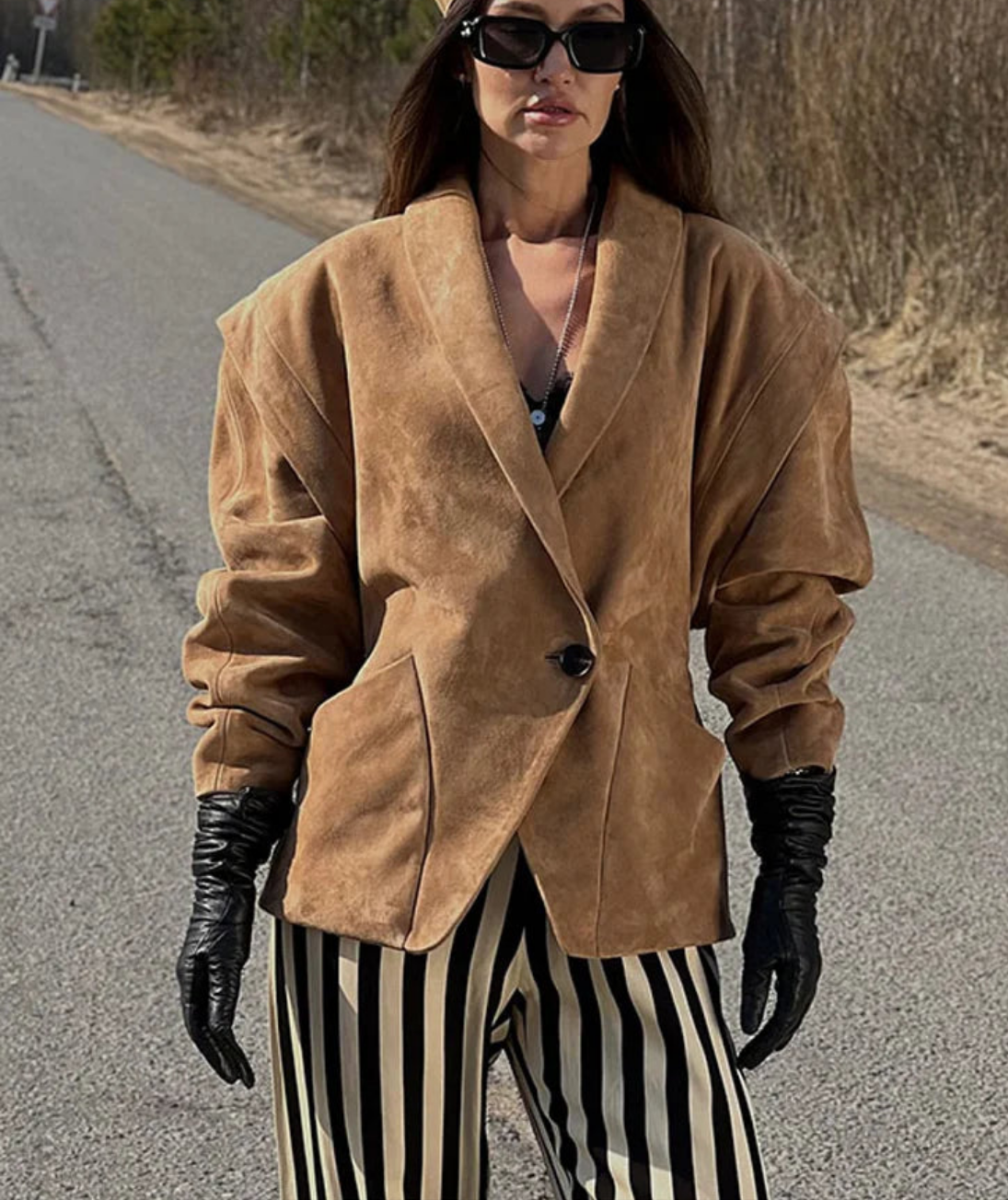 Ritorna lo stile potente e audace! Il Blazer Scamosciato "The Icon" è il capo statement che stavi cercando. Realizzato in una morbida e ricca simil-pelle scamosciata color cammello, cattura perfettamente l'essenza degli anni '80 con la sua silhouette inconfondibile.