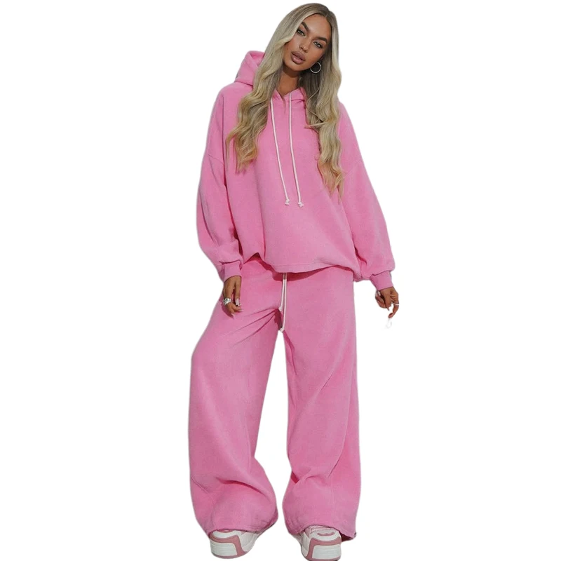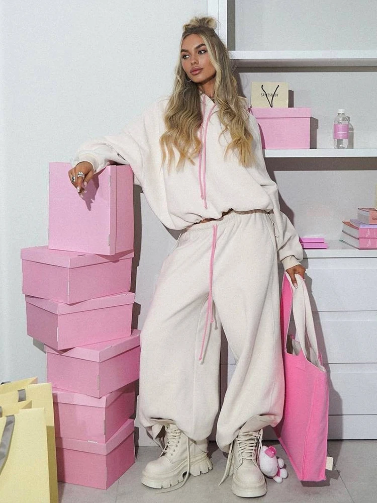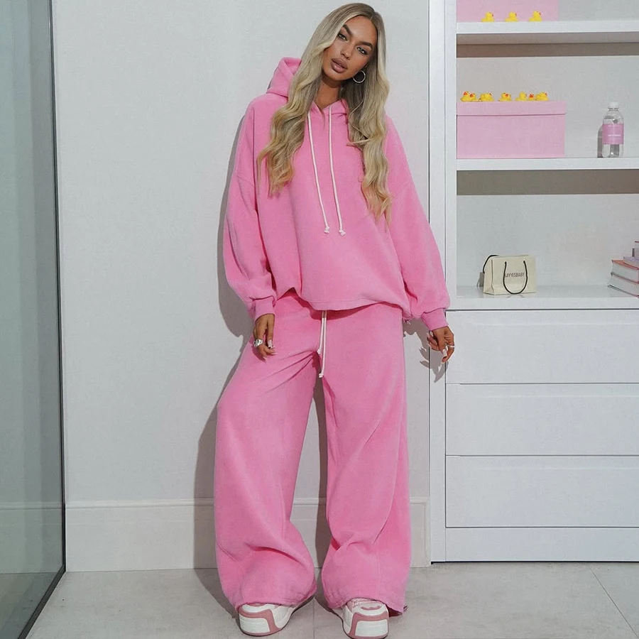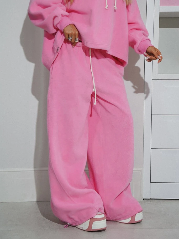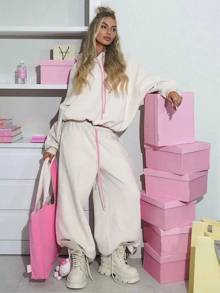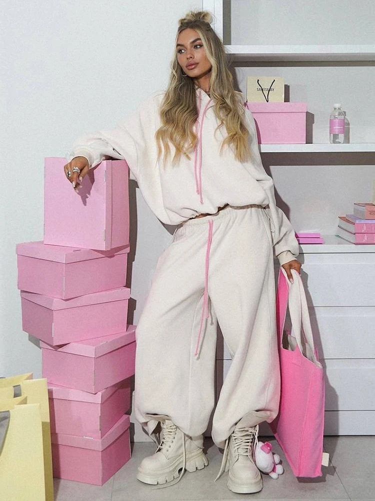 Un classico rinnovato. Questa tuta nera offre un fit rilassato con felpa con cappuccio e pantaloni ampi. I dettagli sui cordini in rosa aggiungono un tocco di colore audace. Tessuto morbido e pesante, perfetto per i mesi più freschi.