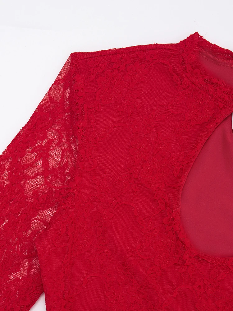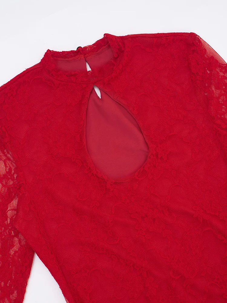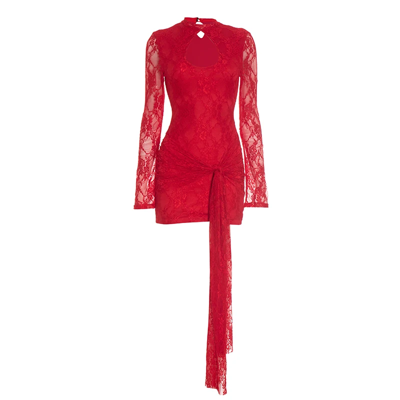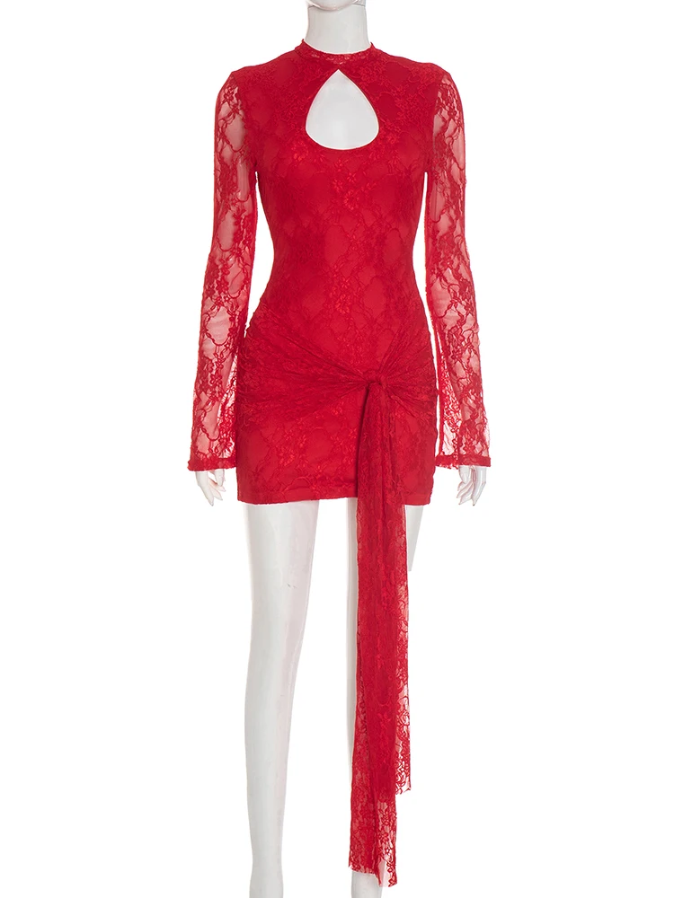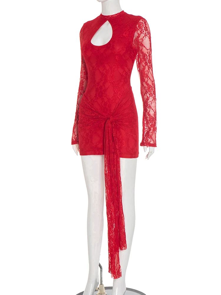Dettagli: Cut-out centrale sul petto, Drappeggio in vita, Mini-spacco laterale, Maniche lunghe in pizzo.