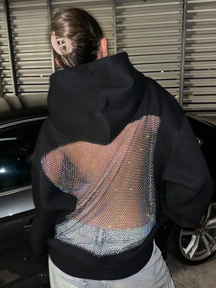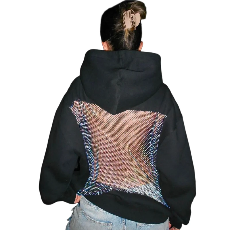La nostra Hoodie "Rebel X" è l'upgrade che la tua felpa nera aspettava. Comfort street-style sul davanti, pura audacia sul retro: la schiena è un incrocio mozzafiato di rete scintillante e strass.
