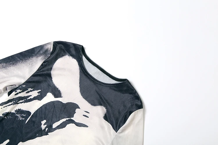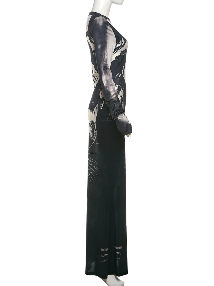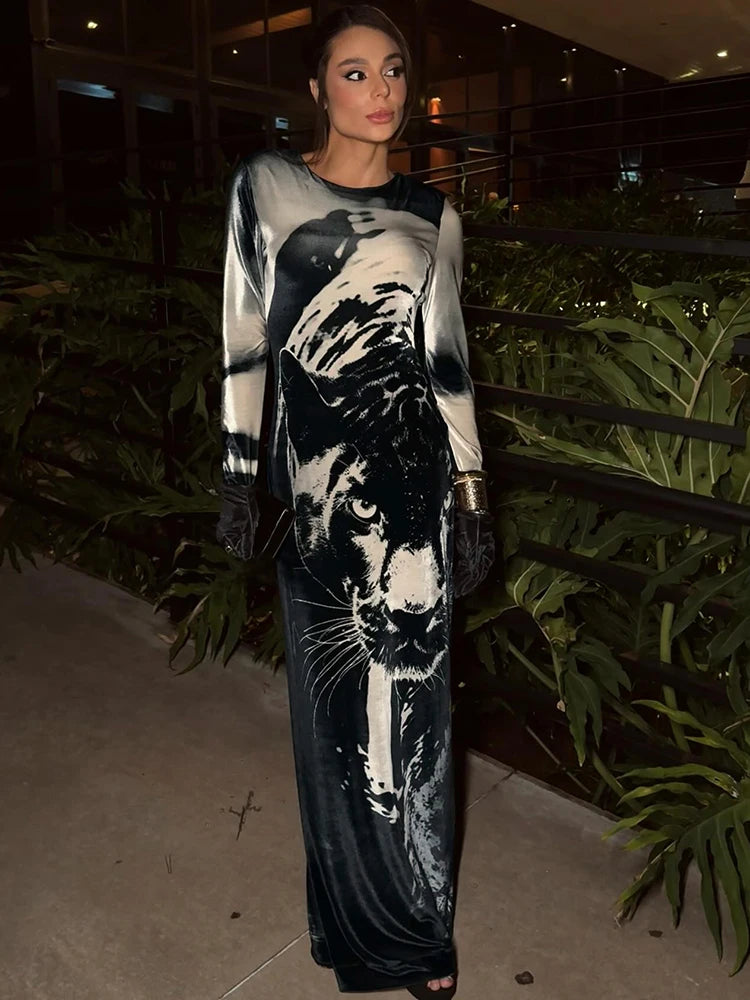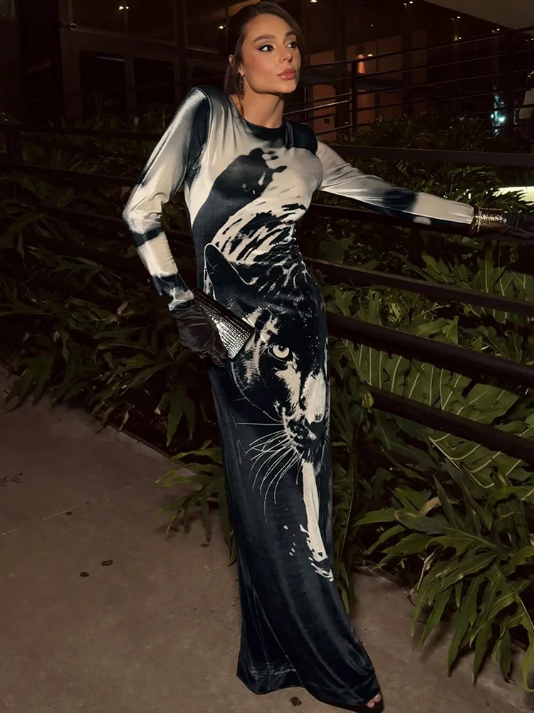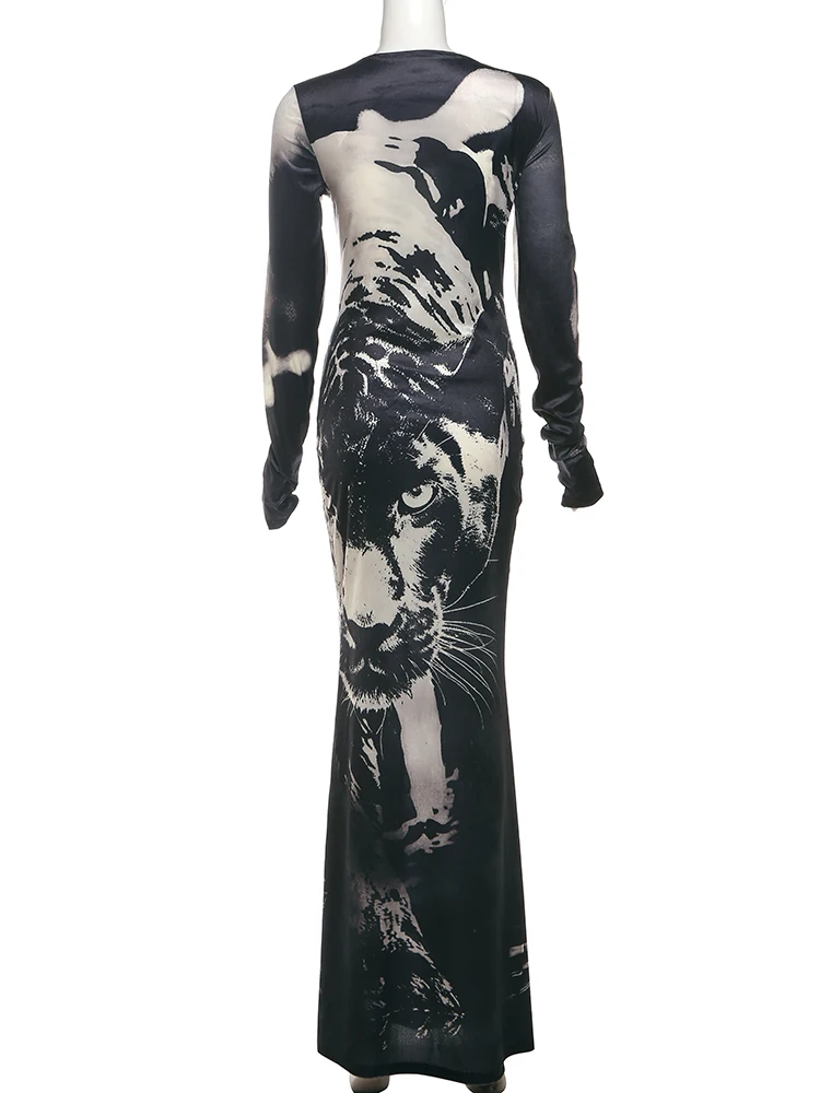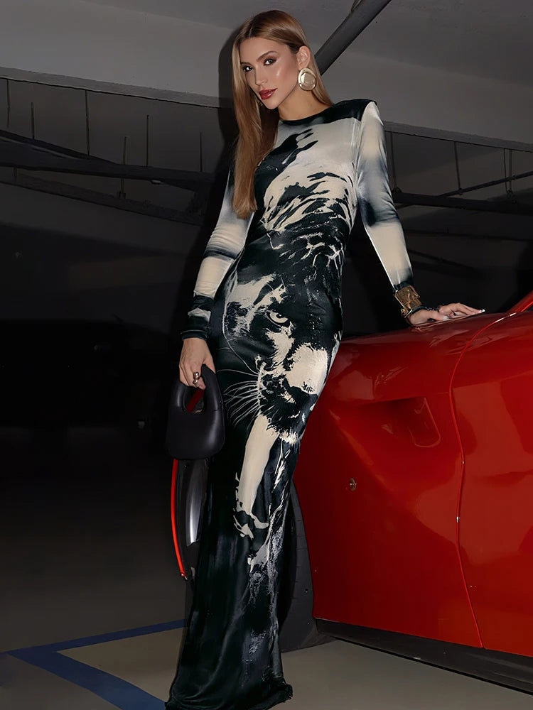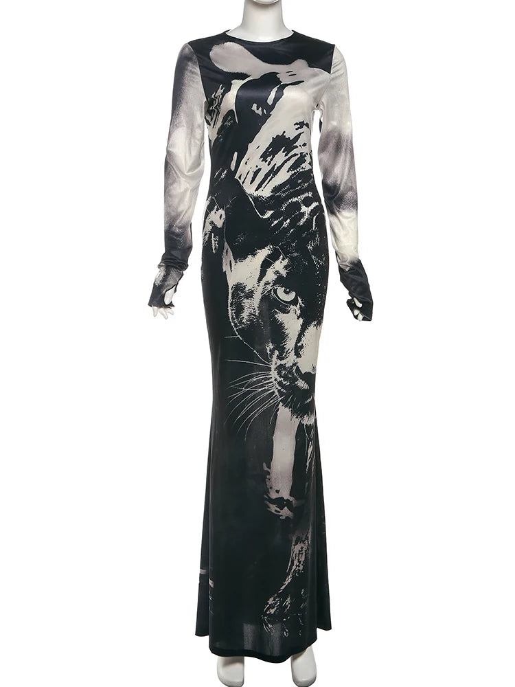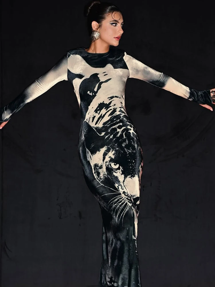 Audacia e fascino si fondono in questo spettacolare abito a sirena a maniche lunghe. Realizzato in un tessuto elasticizzato liscio per esaltare la figura, presenta una sorprendente stampa fotografica in bianco e nero di una Pantera Nera che avvolge elegantemente il corpo. Il collo alto e la linea aderente creano una silhouette sofisticata e potente. Perfetto per serate di gala, eventi esclusivi o per fare una dichiarazione di stile indimenticabile.