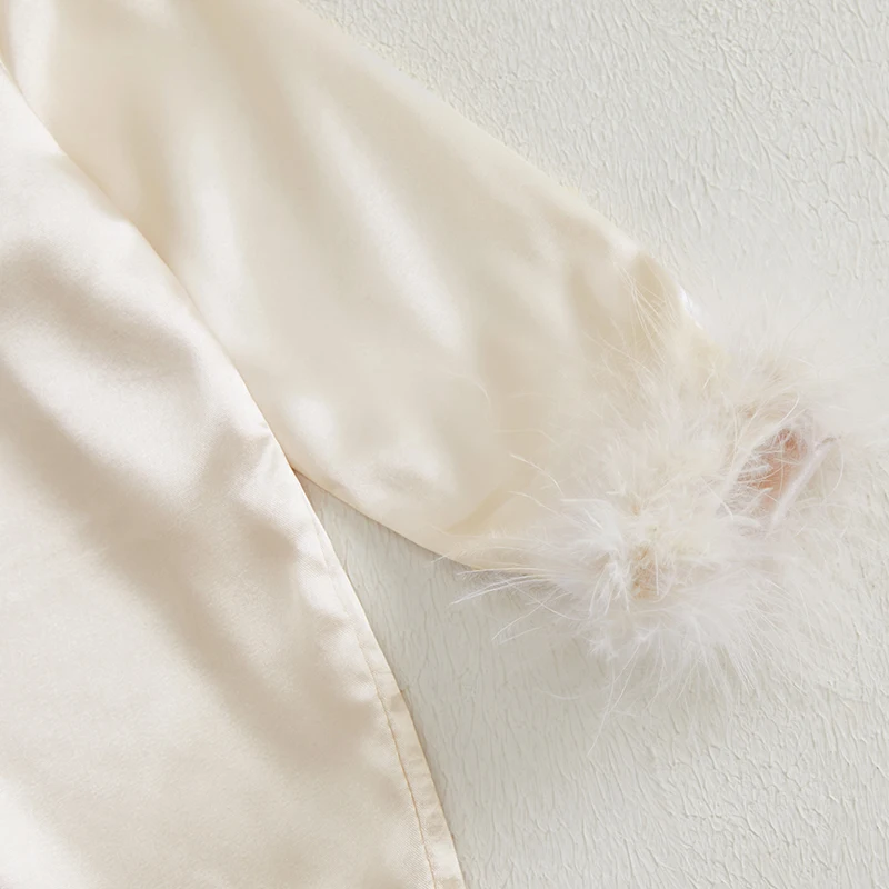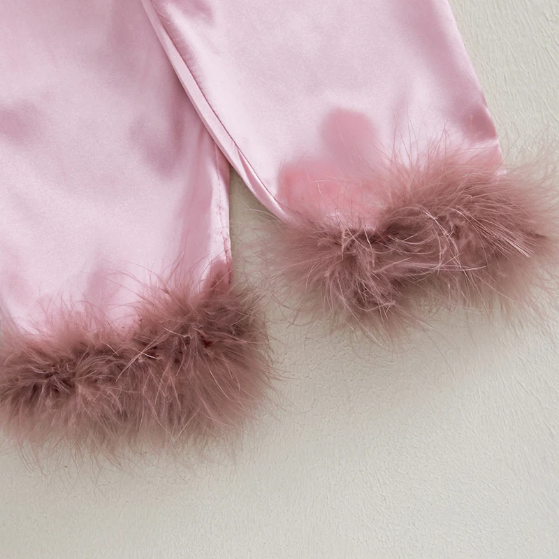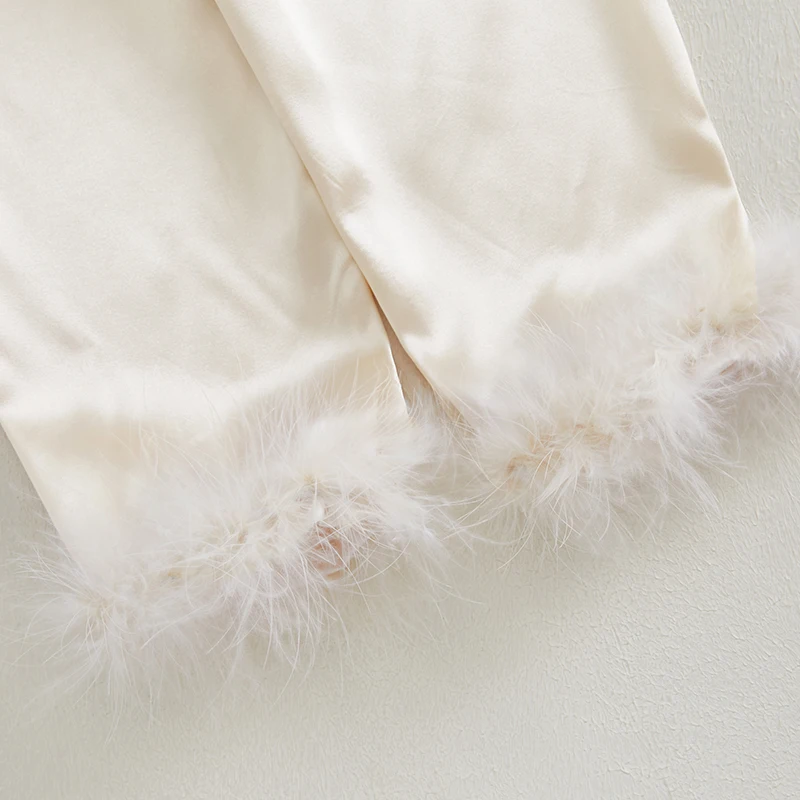 Scopri la nostra collezione di pigiami eleganti, disponibili in quattro colori sofisticati: rosa, nero, bianco e viola. Ogni set è realizzato in morbido tessuto per garantire il massimo comfort, mentre i dettagli in piume sulle maniche e sui pantaloni aggiungono un tocco di lusso. Perfetti per le serate di relax a casa o per un regalo speciale, questi pigiami combinano stile e comodità in un'unica soluzione. Scegli il tuo colore preferito e coccolati con un look chic anche durante la notte!