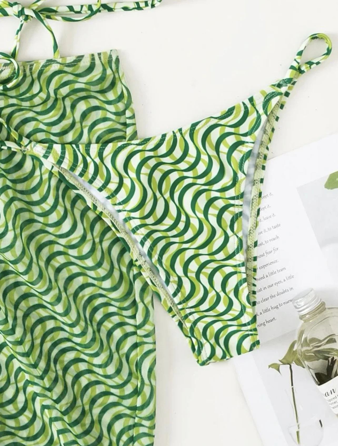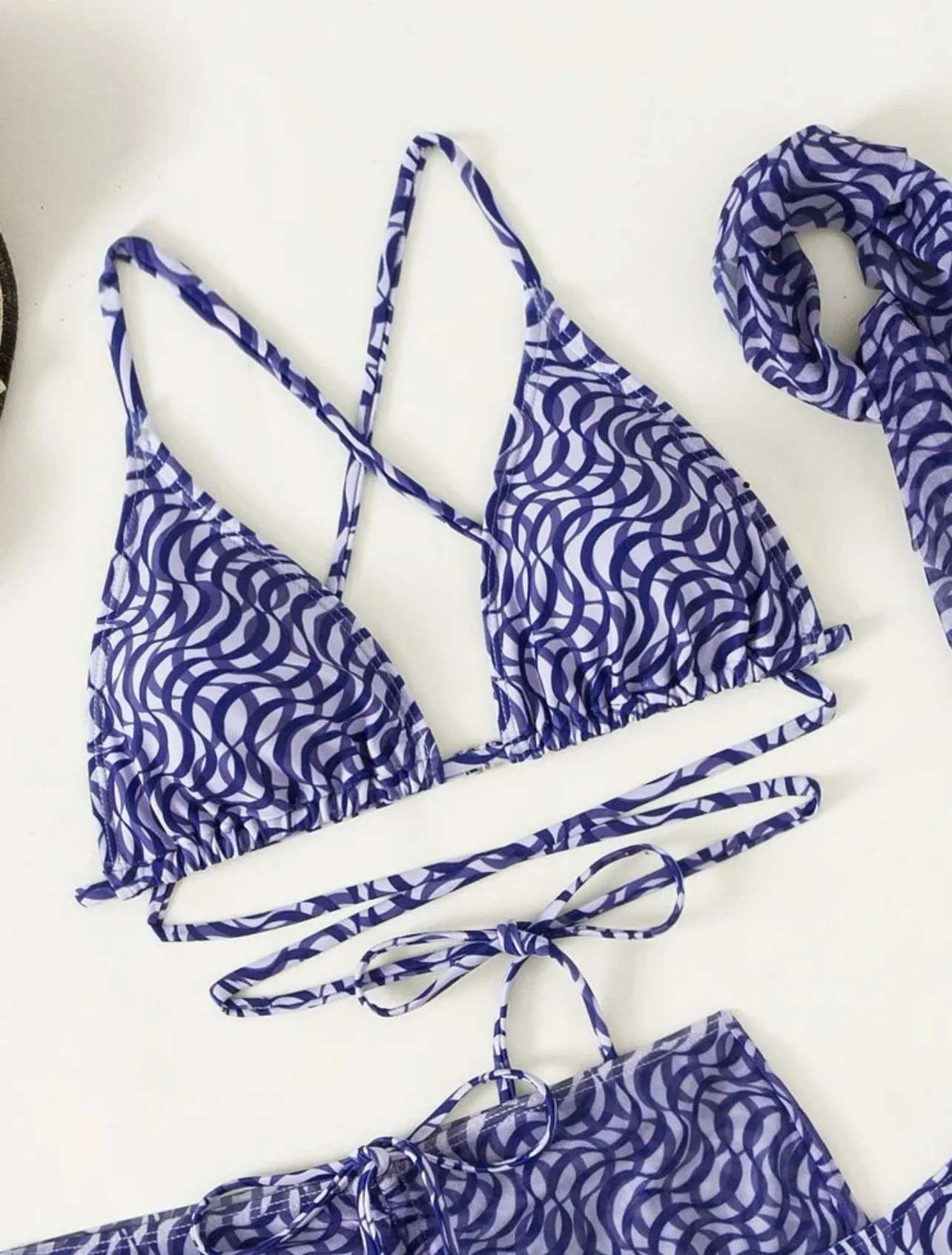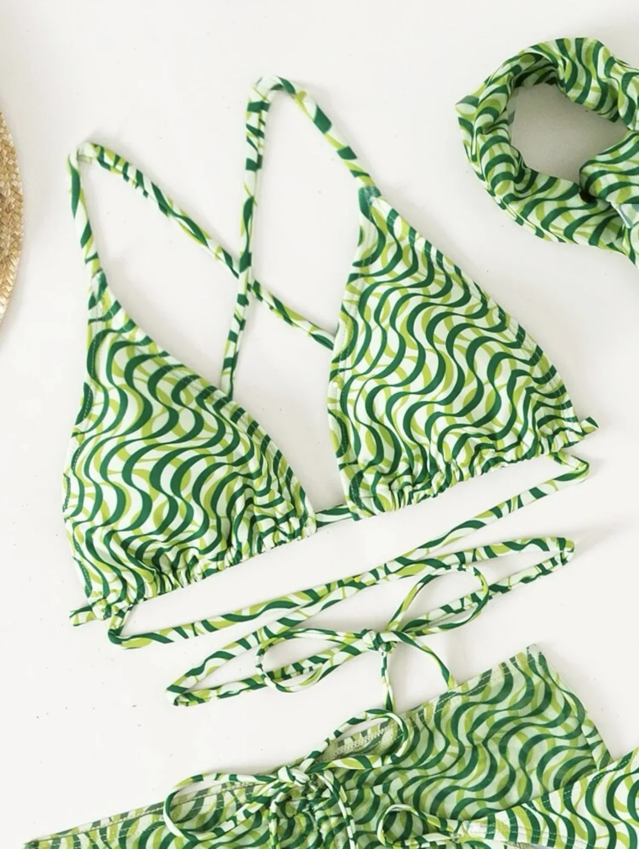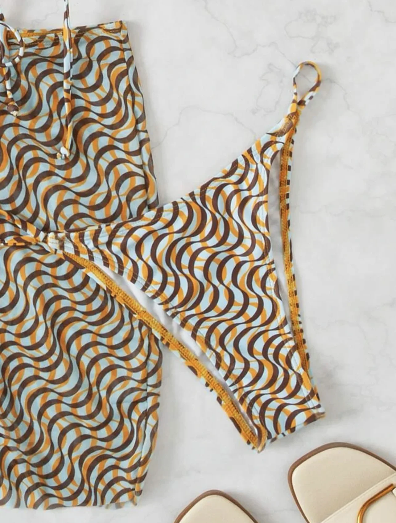Questo coordinato mozzafiato è composto da un bikini/bralette seducente e una mini-gonna coordianta, entrambi realizzati con una lavorazione unica a rete, impreziosita da dettagli luccicanti che catturano la luce ad ogni movimento.