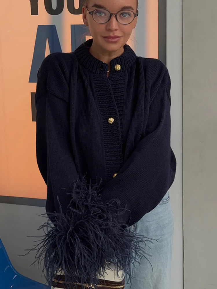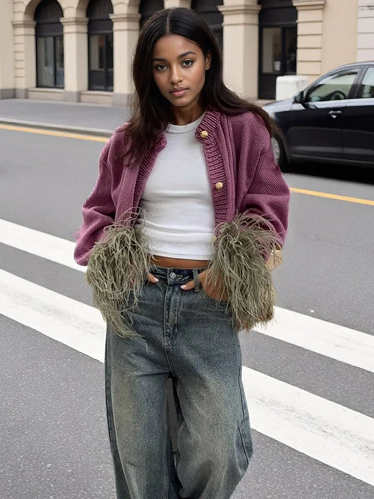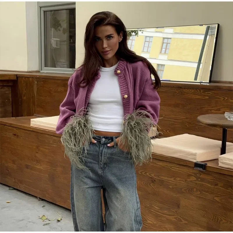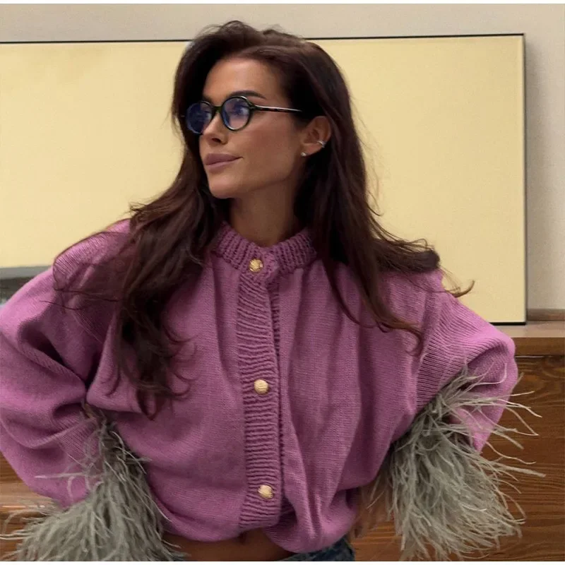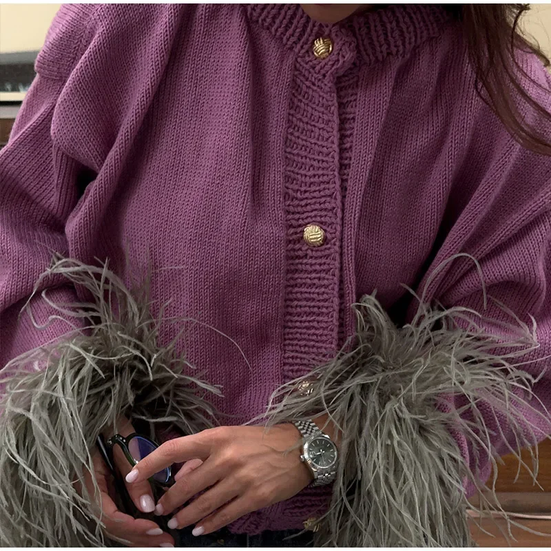 Questo capo statement unisce il comfort di un cardigan in velluto a coste al lusso inaspettato dei dettagli couture. Il tessuto morbido e avvolgente color viola scuro/fucsia (o indicare il colore esatto, ad es. borgogna, malva, ciclamino) è impreziosito da vistosi polsini in piuma in contrasto, che aggiungono volume e movimento.