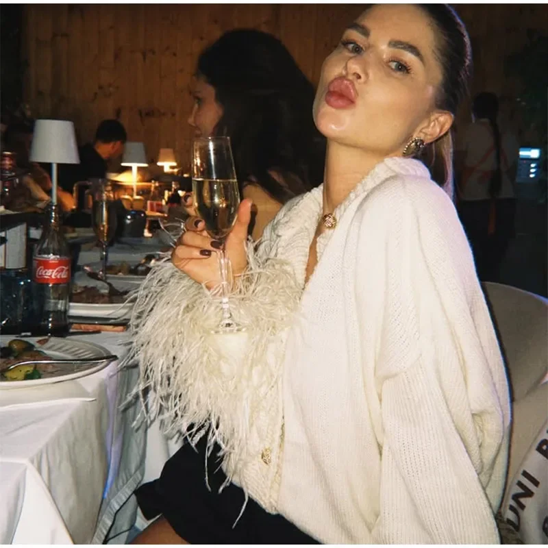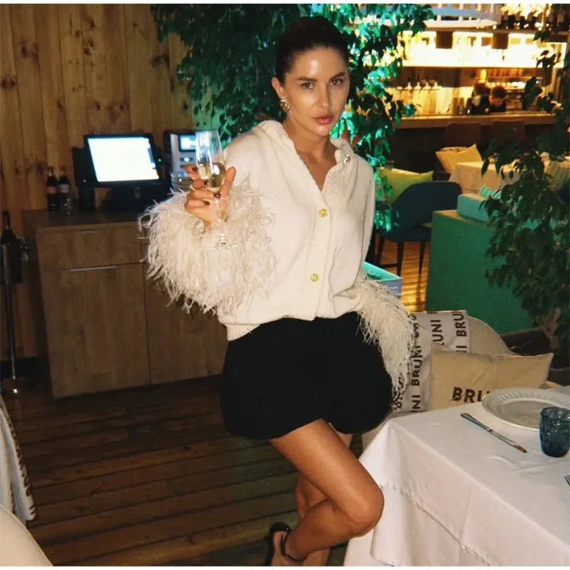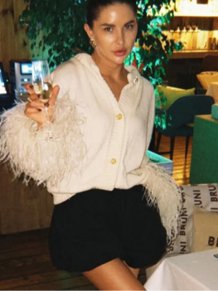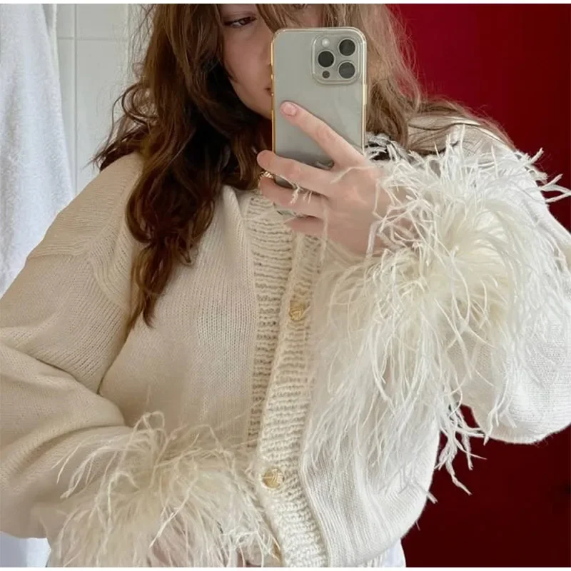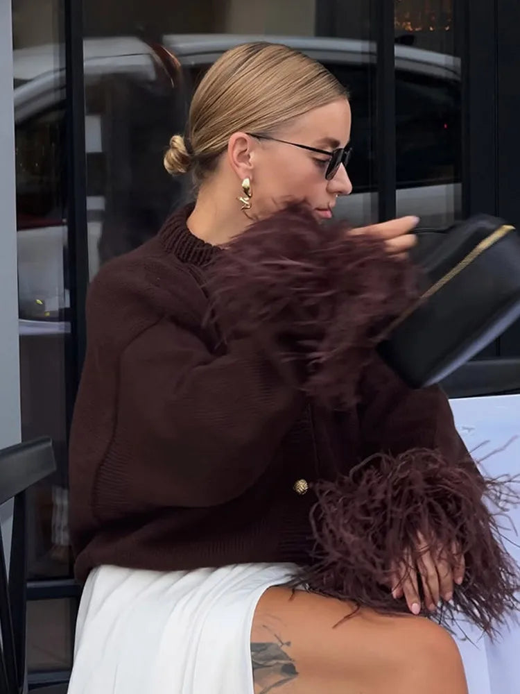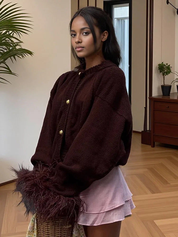 Questo capo statement unisce il comfort di un cardigan in velluto a coste al lusso inaspettato dei dettagli couture. Il tessuto morbido e avvolgente color viola scuro/fucsia (o indicare il colore esatto, ad es. borgogna, malva, ciclamino) è impreziosito da vistosi polsini in piuma in contrasto, che aggiungono volume e movimento.