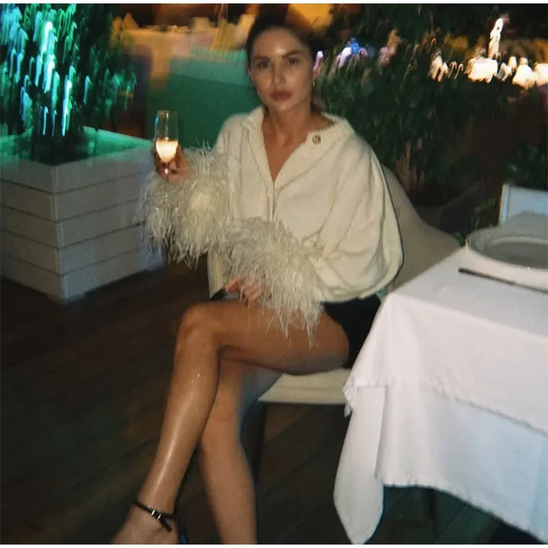 - Dettaglio Piume: Polsini removibili (se lo sono) o fissi in piume verde oliva/grigio. Ideali per un tocco glamour o un outfit da sera.