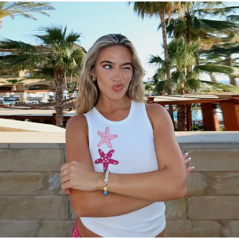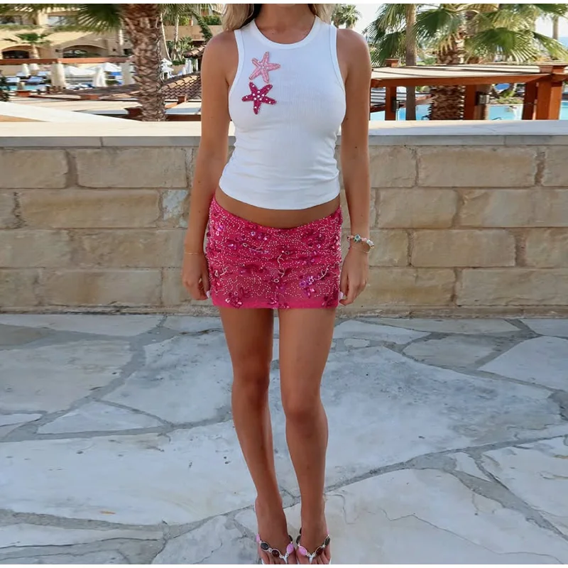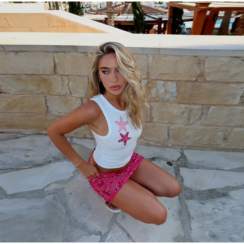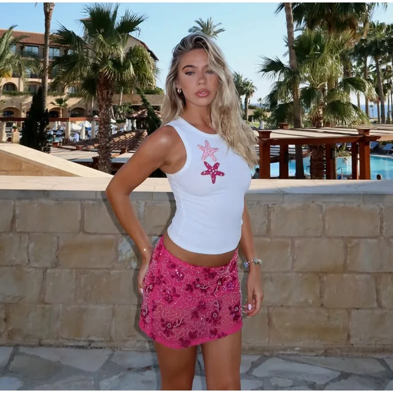 Questo adorabile duo presenta top a canotta in cotone bianco, decorati con vicaci motivi marini come stelle marini e pesciolini, che aggiungono un tocco di allegriatropicale. La gonna disponibile in rosa e azzurro , sfoggiano stampe coordinate e una vestibilità comoda.