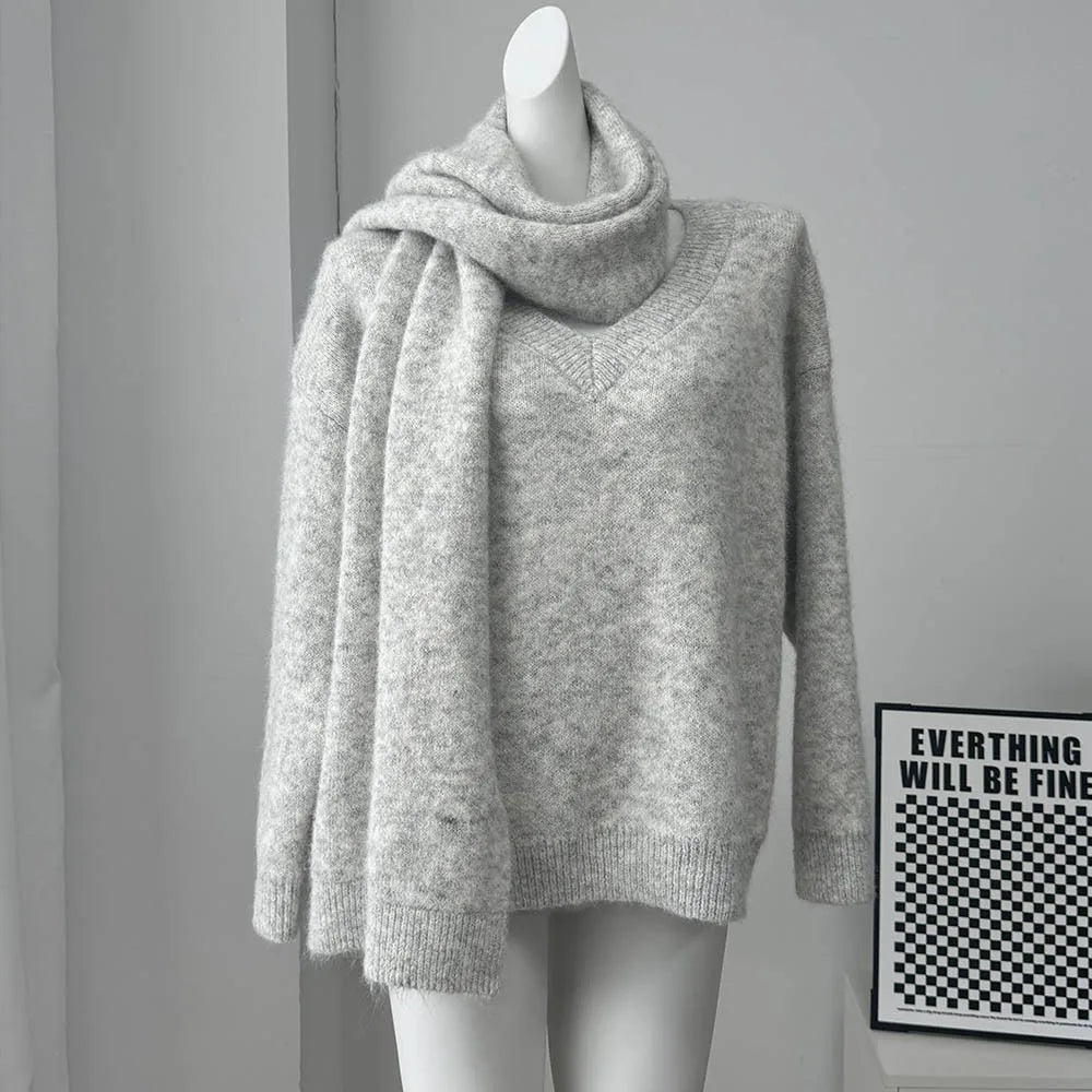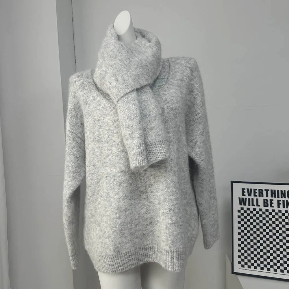 Maglione Donna con Sciarpa Scollo V - Pullover Morbido Loose Fit Autunno Inverno