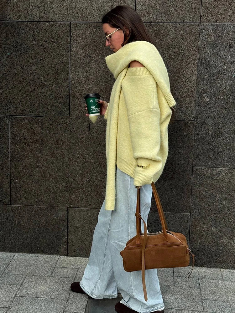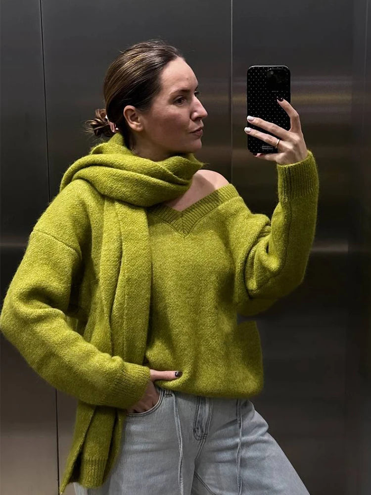 Maglione Donna con Sciarpa Scollo V - Pullover Morbido Loose Fit