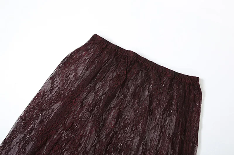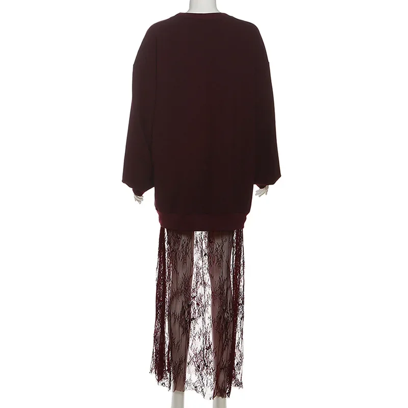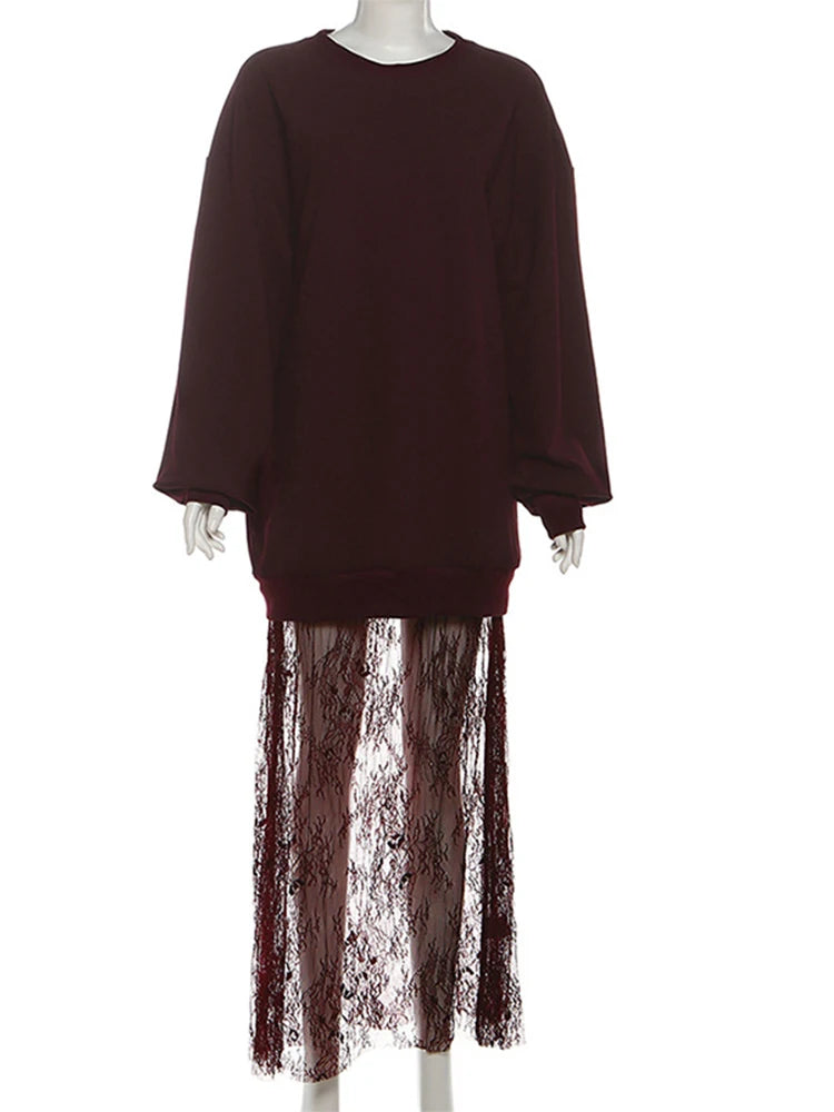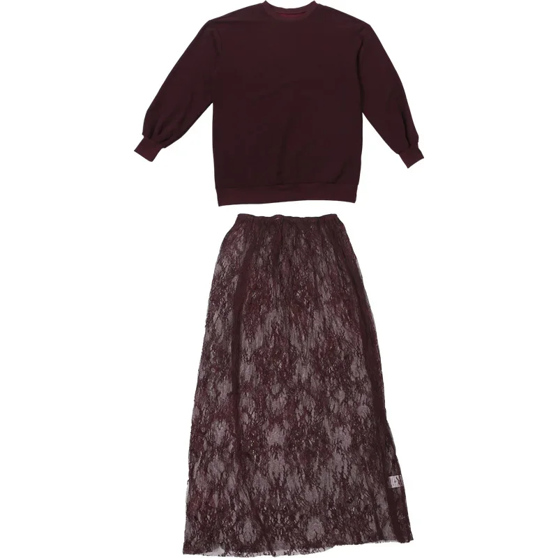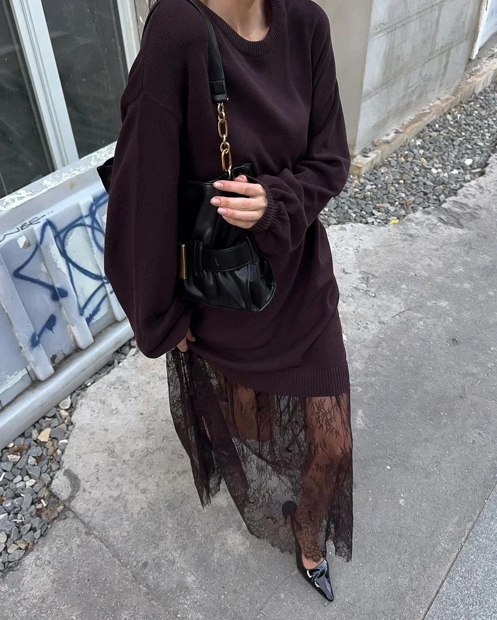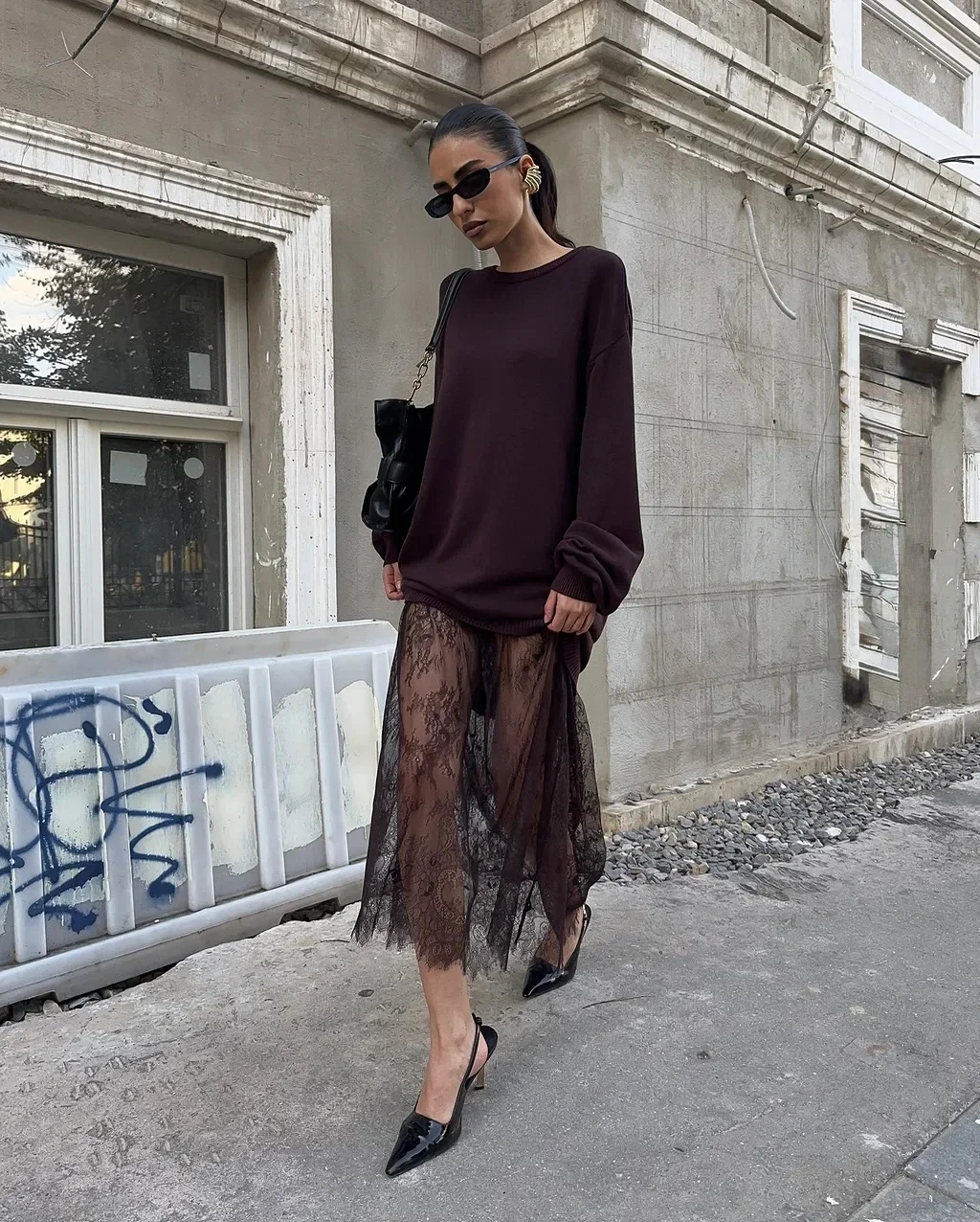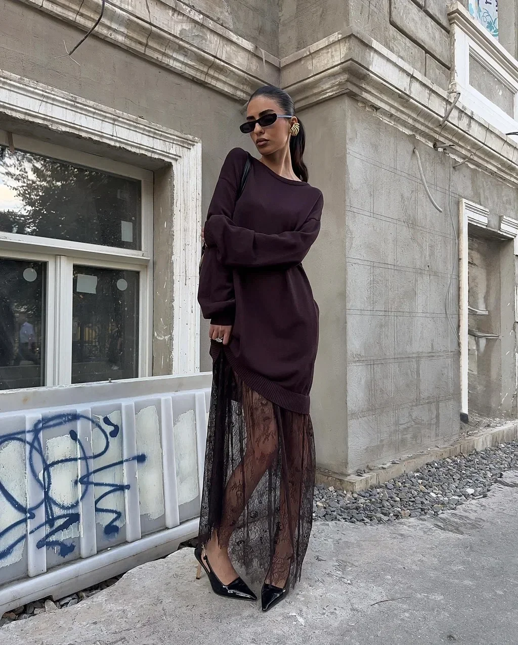 Cattura l'attenzione con un look che parla di mistero e disinvoltura. Questo completo incarna l'essenza del cool urbano: un caldo maglione in tonalità scura (antracite/marrone cioccolato/nero) crea una silhouette rilassata, mentre la gonna/sottoveste lunga in pizzo nero emerge dal fondo, aggiungendo profondità e un tocco gotico-chic.