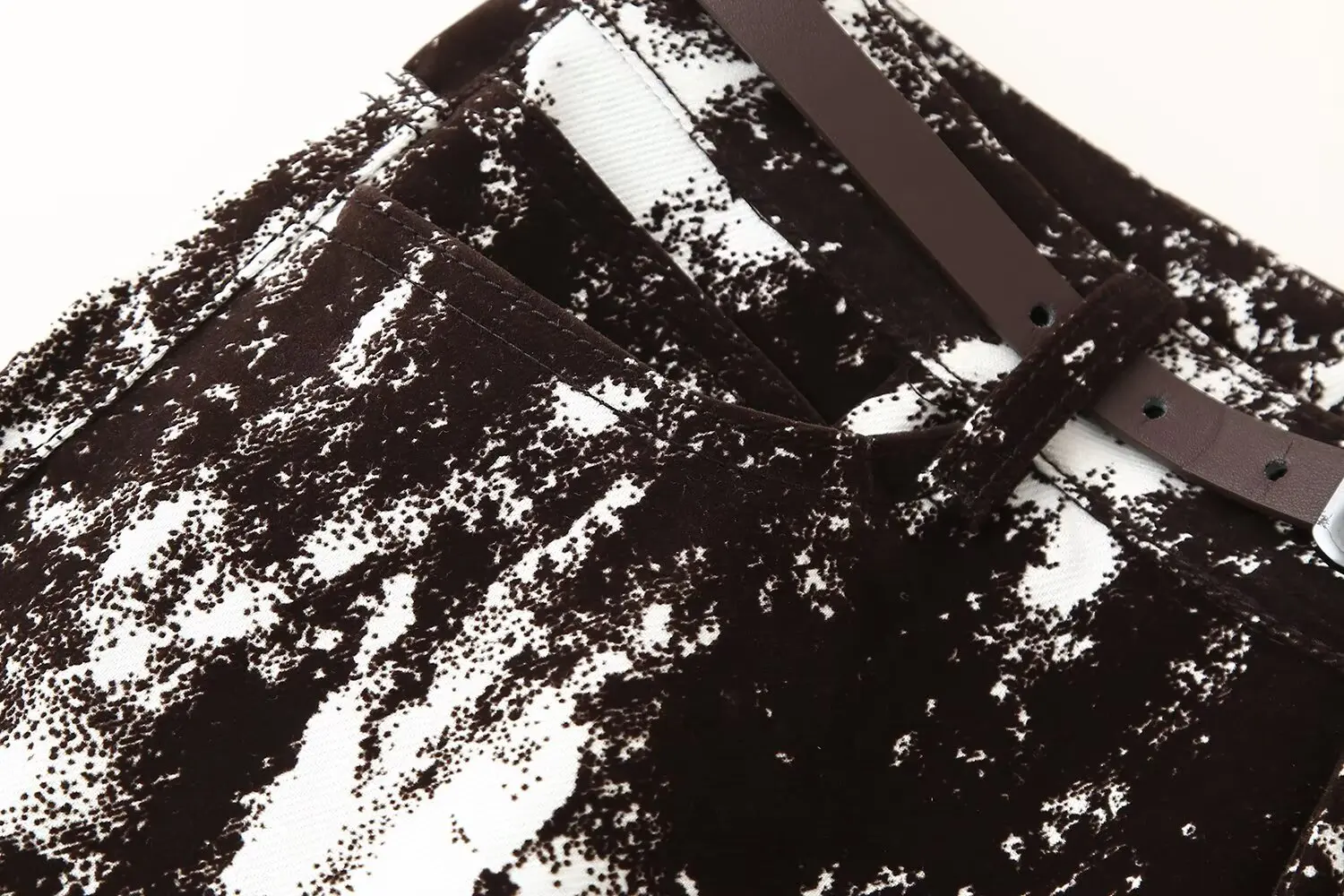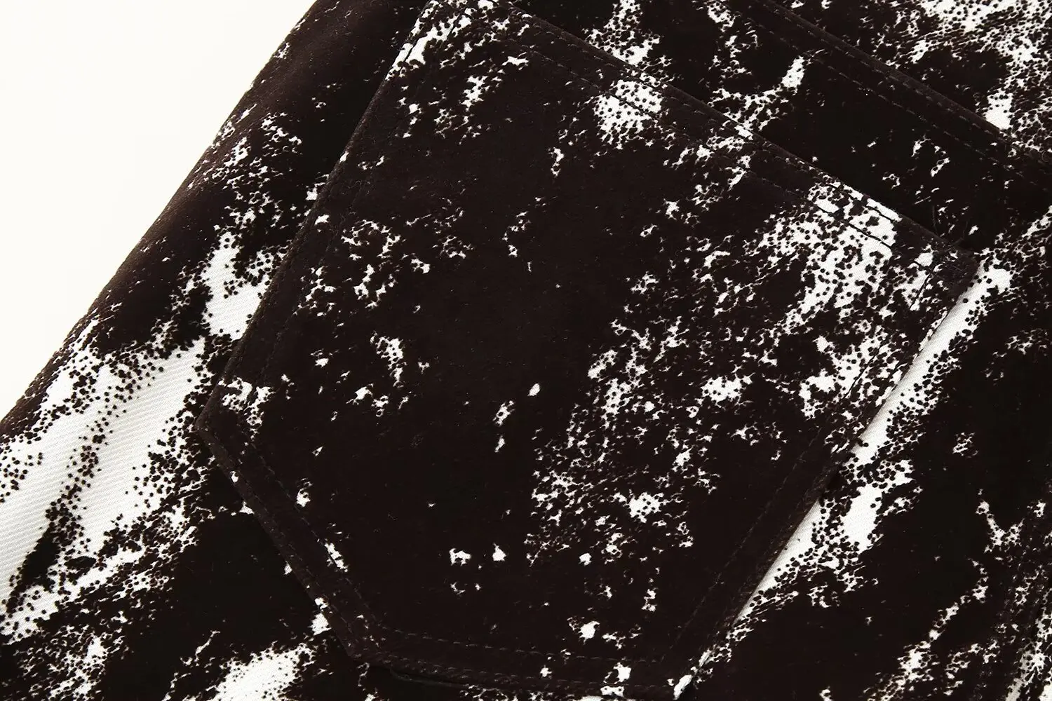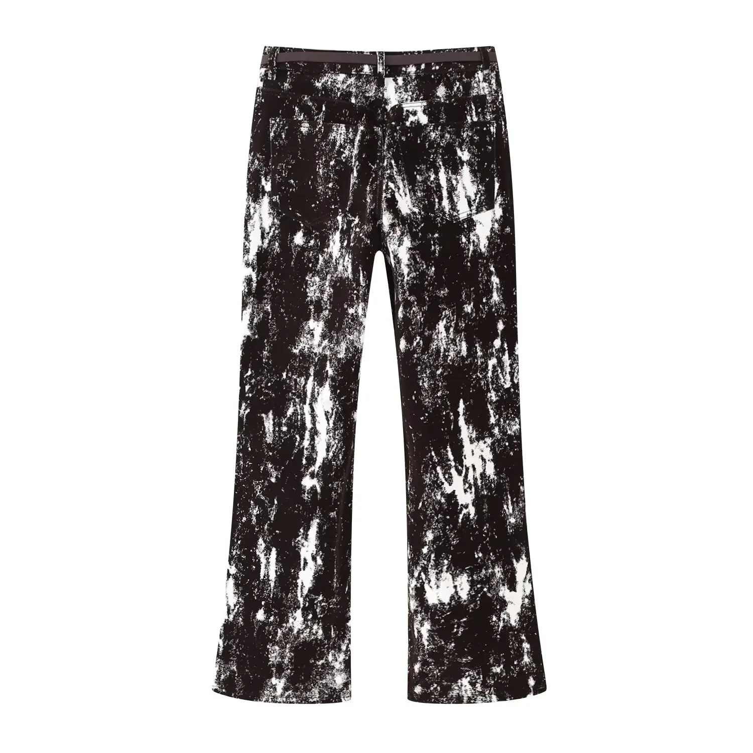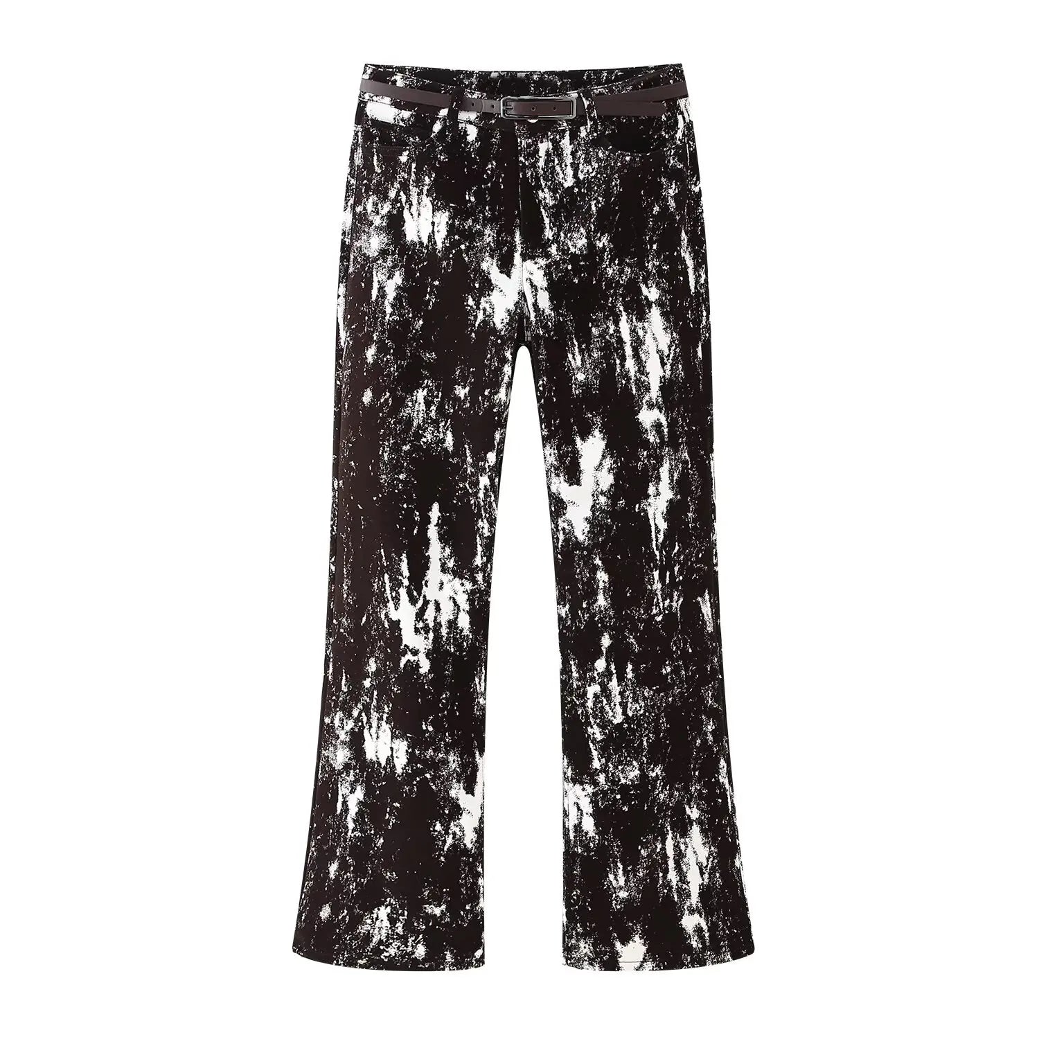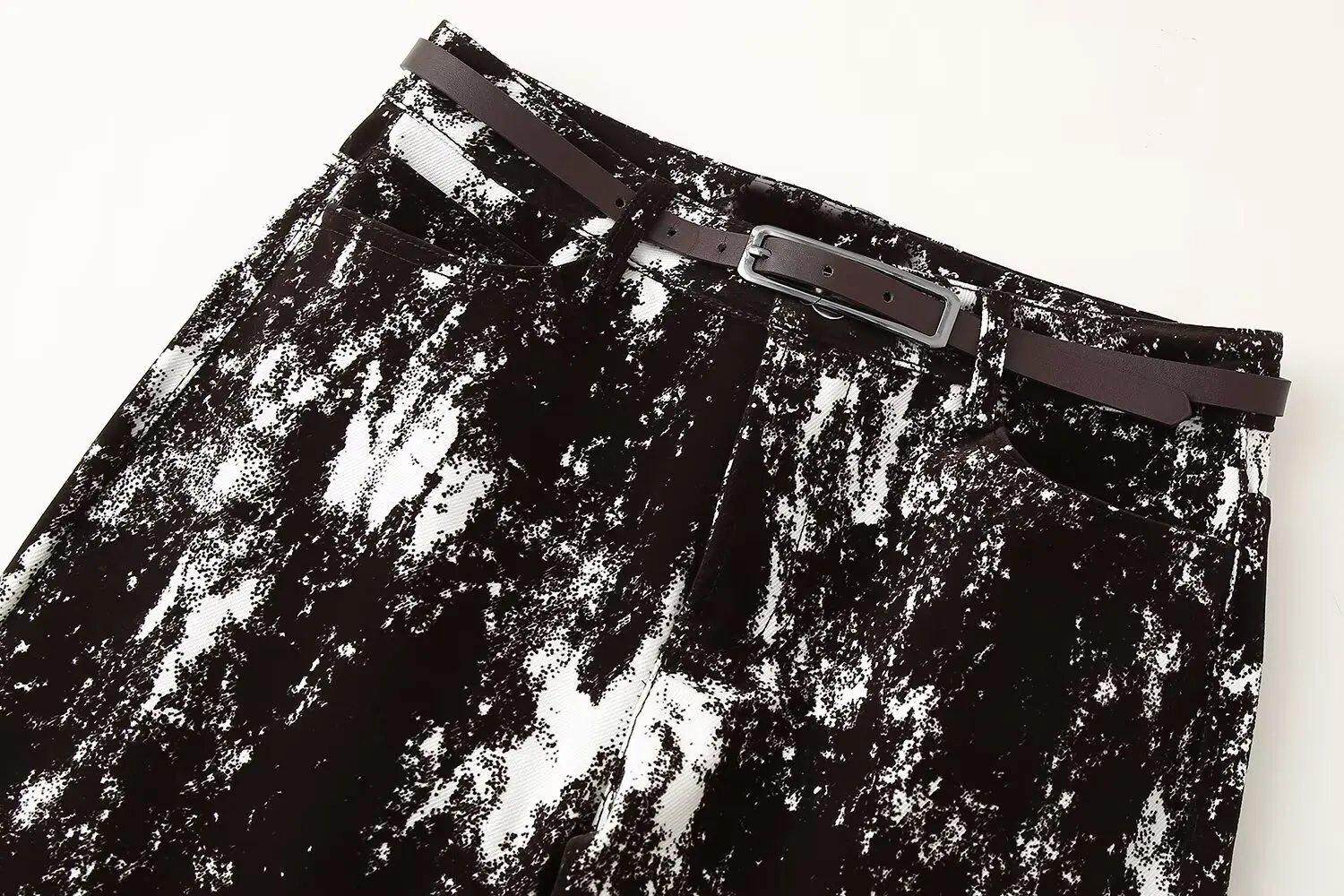 I Pantaloni: gamba ampia, seguono la stessa dinamica fantasia, offrendo comfort e una silhouette di tendenza. Indossali con la giacca per un completo mozzafiato, oppure con un top nero o bianco per un outfit più sobrio.
